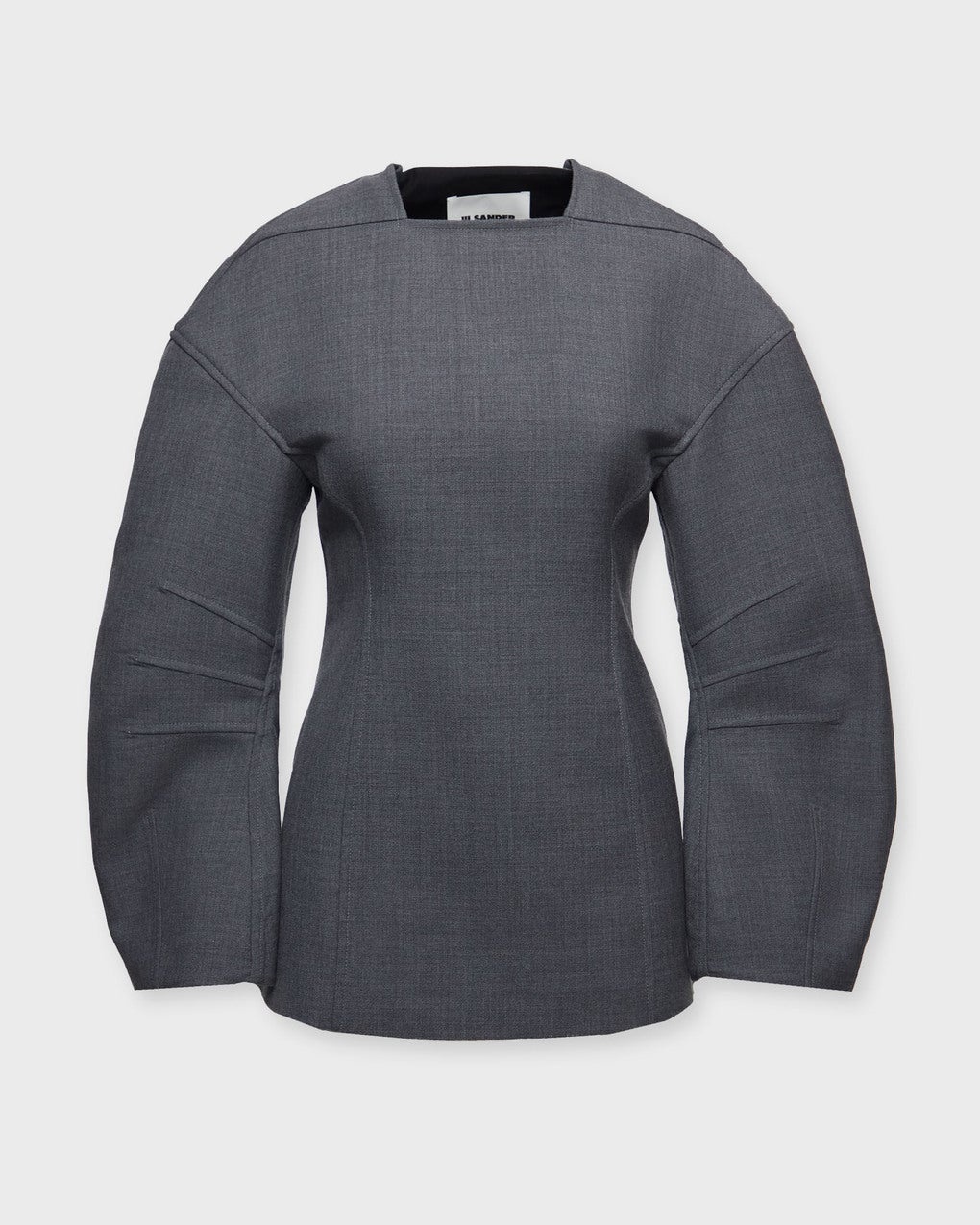 Crew Neck Top from Jil Sander. A trendy long-sleeved top with a sculptural shape. Designed with a triangular neckline and long sleeves with shaped seams. Made in Italy from 100% wool. Size and Fit - Fits true to size, choose your usual size - The model is 175 cm tall and is wearing size S Specification - Article number - ID: 173836-082 - Brand: JIL SANDER - Color: Grey - Washing Instructions: Dry clean - Made of: Composition: 100& wool
