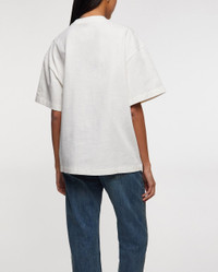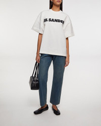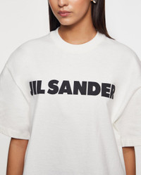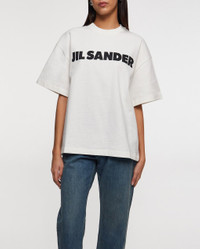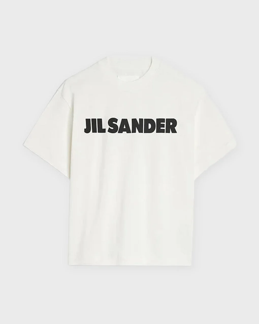 T-shirt Logo from Jil Sander. This oversized T-shirt offers modern aesthetics with timeless comfort. With its boxy shape, dropped shoulders, and clean lines, it provides a relaxed yet sophisticated look. Made from lightweight, structured cotton jersey for an airy feel. The printed Jil Sander logo on the front adds a subtle touch of the brand's signature style. Perfect for those who appreciate minimalist elegance in everyday wear. Size and Fit - Fits true to size, choose your usual size - The model is 176 cm tall and is wearing size S Specification - Article number - ID: 175062-711 - Brand: JIL SANDER - Color: Porcelain - Washing Instructions: Machine wash - Made of: 100% Cotton