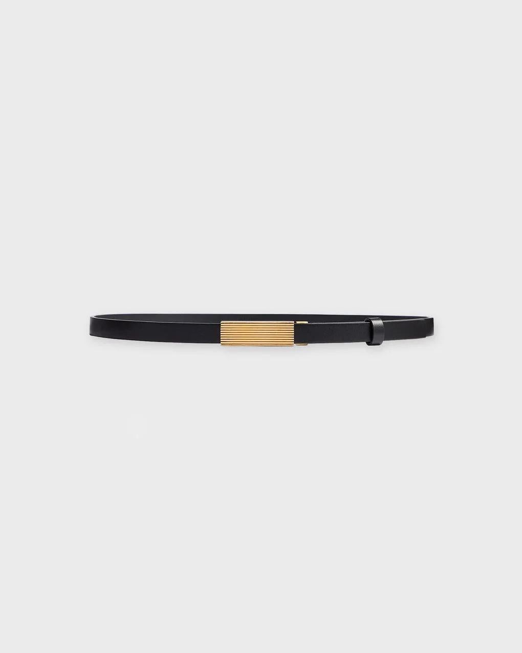 Belt Empire Antique from Khaite. A sleek calfskin belt elevated with Khaite’s signature Empire hardware, reimagined as a polished centerpiece. Crafted in Italy from 18-karat gold-plated brass, the jewellery-grade closure fastens securely without traditional belt holes, offering a clean and modern finish. Specification - Article number - ID: 177406-000 - Brand: Khaite - Color: Black