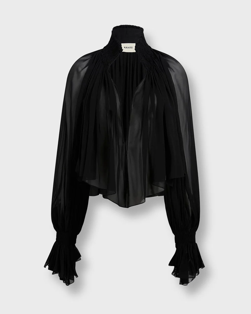 Blouse Durer from Khaite. This fluidly formed shirt is framed by a high stand collar for a regal presence. The cutaway silhouette is animated by hand-crushed cartridge pleating, with billowing sleeves cinched at the wrist. Designed to be worn with the slit neckline at the front or the back. Size and Fit - Fits true to size, choose your usual size - The model is 175 cm tall and is wearing size S Specification - Article number - ID: 177412-000 - Brand: Khaite - Color: Black - Washing Instructions: Dry Clean - Made of: 100% silk