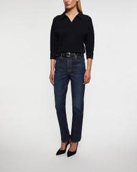 Jeans Viv Jean Lansing from Khaite. A pair of jeans with a slim fit and an ankle-length cut. This mid-rise style reimagines the classic cigarette pant in timeless five-pocket denim with a touch of stretch for extra comfort. Each pair is finished with an antiqued nickel button featuring the “Khaite” logo. Size and Fit - Fits true to size, choose your usual size - The model is 176 cm tall and is wearing size 27 Specification - Article number - ID: 176334-906 - Brand: Khaite - Color: Dark blue wash - Washing Instructions: Hand wash - Made of: Stretch denim (98% cotton, 2% polyurethane)