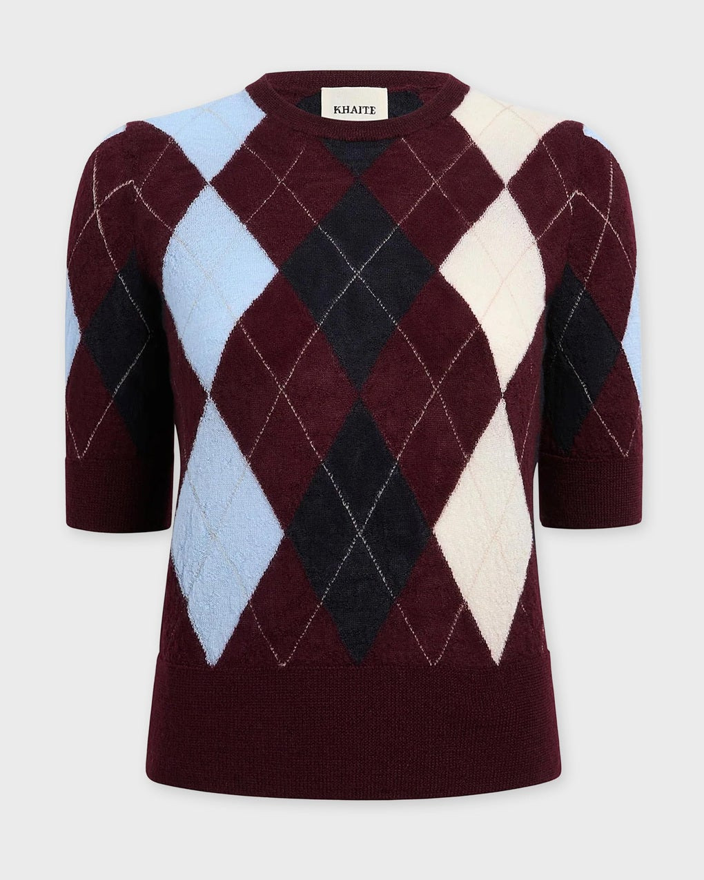 Top Anders by Khaite. Lightweight intarsia-knit pullover that offers a modern take on the classic argyle pattern. Crafted in Italy from an airy blend of cashmere and mohair. Finished with finely ribbed edges. Size and Fit - Fits true to size, choose your usual size - The model is 177 cm tall and is wearing size S Specification - Article number - ID: 176345-350 - Brand: Khaite - Color: Burgundy - Washing Instructions: Dry clean - Made of: 70% cashmere, 30% mohair