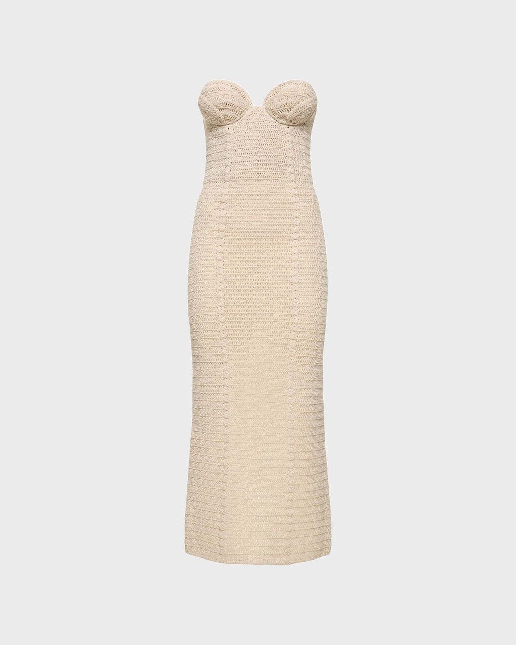 Dress Crochet from Magda Butrym. Elegant crochet dress in midi length. The dress is designed for a figure-hugging silhouette and is decorated with two crocheted flowers on the cups. The dress has a built-in corset which creates a flattering fit that accentuates your silhouette. The dress finishes above the ankle and has a high slit at the back. The dress is unlined. Size and Fit - Fits true to size, choose your usual size - The model is 172 cm tall and is wearing size FR 36 Specification - Article number - ID: 173118-082 - Brand: Magda Butrym - Color: Beige