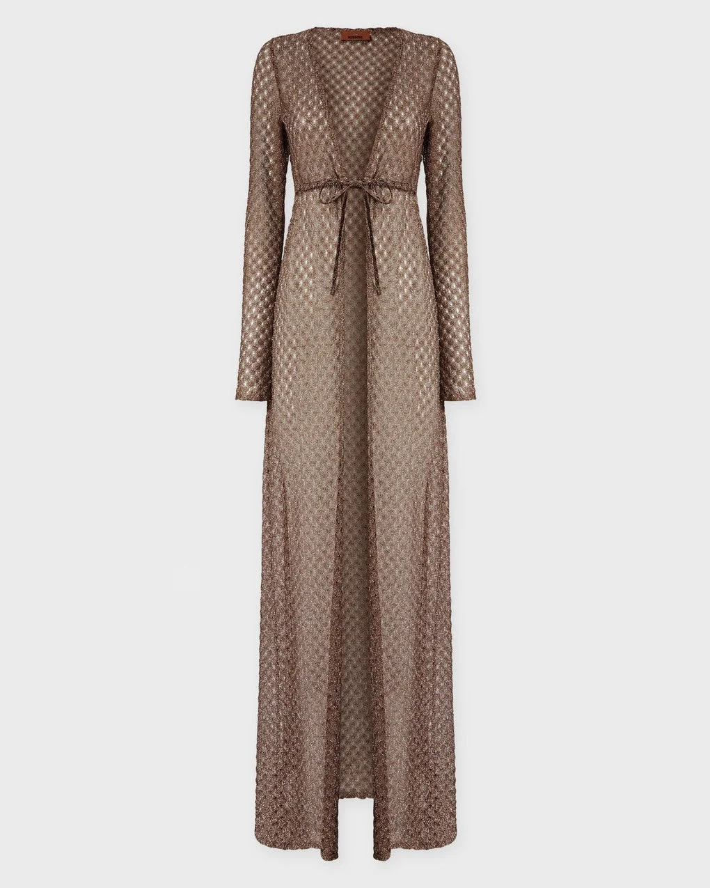 Cardigan Long Cover Up from Missoni. A long, open cardigan in shimmering viscose lame featuring a delicate spiderweb pattern. The soft, lightweight fabric makes it ideal for layering over both casual and more polished looks. Size and Fit - Fits true to size, choose your usual size - The model is 175 cm tall and is wearing size IT 42 Specification - Article number - ID: 178334-083 - Brand: Missoni - Color: Brown - Washing Instructions: Dry clean - Made of: 87% Rayon, 13% Metal Fiber