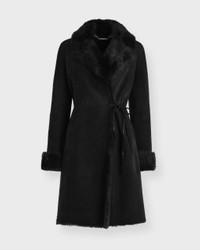 Coat Joni Midlength from Nour Hammour. A mid-length coat crafted from velvety shearling with Toscana trim, offering a rich and enveloping feel. Designed in a wrap silhouette with a generous collar and a soft yet structured drape, the coat falls with poise and natural elegance. An evocative outerwear piece defined by comfort, refinement, and timeless appeal. Size and Fit - Fits true to size, choose your usual size - The model is 175 cm tall and is wearing size 36 Specification - Article number - ID: 177490-000 - Brand: NOUR HAMMOUR - Color: Black - Washing Instructions: Dry Clean - Made of: 100% Lambskin Shearling