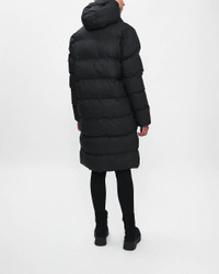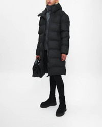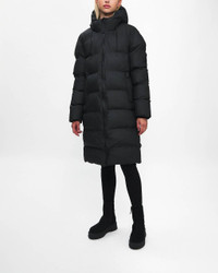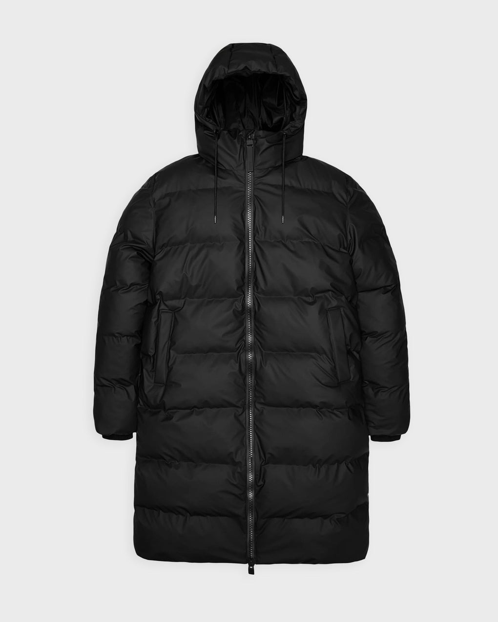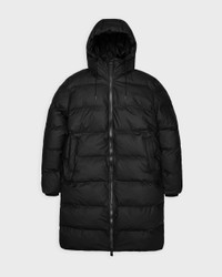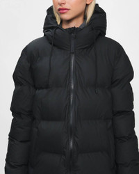 Jacket Alta Long Puffer from Rains. The winterjacket is a waterproof with a clean, easy-to-wear longer puffer aesthetic. The jacket is characterized by refined silhouettes, signature chamber widths and pared-back details. This elevated puffer is built on featherless chamber technology, and cut from signature waterproof and breathable fabric, keeping you warm and comfortable in the colder season climates.The jacket features a 2-way coated zip closure, ultrasonically double-welded seams, spacious fleece-lined welt side pockets, concealed ribbed storm cuffs and an internal chest pocket. The silhouette is topped by a drawstring insulated hood. Size and Fit - Fits true to size, choose your usual size - The model is 176 cm tall and is wearing size S Specification - Article number - ID: 170979-000 - Brand: Rains - Color: Black - Washing Instructions: Use wool settings - Made of: 100% Polyester, Lining 100% Nylon and Filling Performance recycled fiber insulation