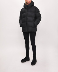Jacket Alta Puffer Black from Rains. A waterproof winter jacket distinguished by its elegant silhouette and uncomplicated puffer aesthetic. It features an interior chest pocket with a zipper and concealed, fleece-lined side pockets for added comfort. The jacket has an insulated hood with a drawstring to keep you warm and comfortable even in the coldest climates. This sleek puffer jacket is constructed using woven chamber technology and is made from Rains' signature PU fabric with double-welded seams. The material is lightweight, durable, and has a smooth feel. Size and Fit - Fits true to size, choose your usual size - The model is 176 cm tall and is wearing size S. Specification - Article number - ID: 174745-000 - Brand: Rains - Color: Black - Washing Instructions: Machine wash - Made of: 100% polyester, Filling: 100% polyester ,Lining: 100% nylon