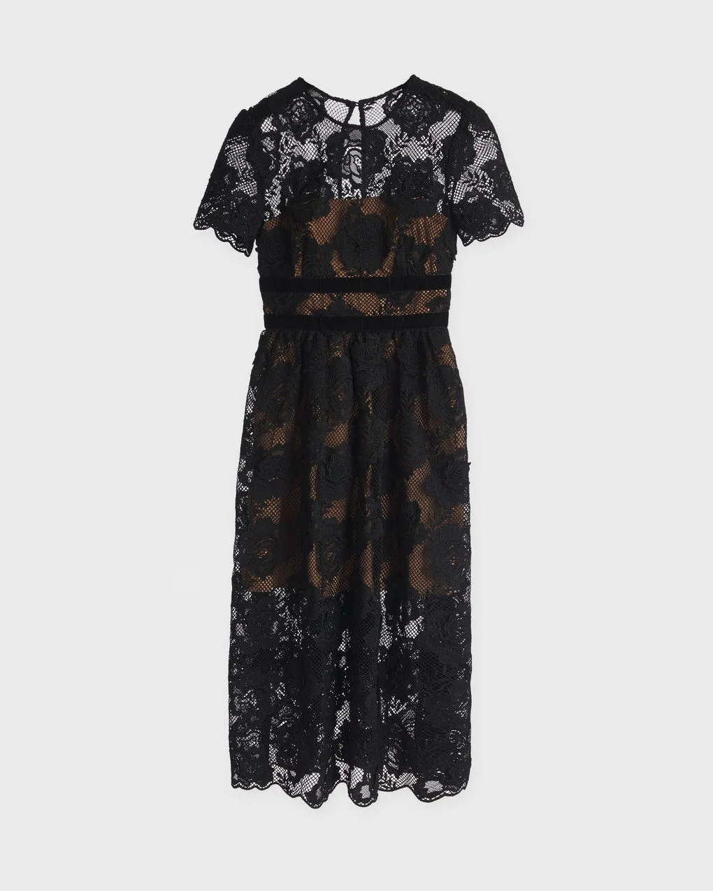 The perfect dress for a coctail party or a wedding. Step into timeless elegance with Self-Portrait's midi dress, featuring delicate bow accents and intricate details. This dress effortlessly combines sophistication with femininity, making it perfect for any special occasion. The soft lace fabric drapes beautifully, while the carefully placed bows add a charming touch. Size and Fit - Runs a bit small in size, if you are between sizes please choose the larger one - The model is 176 cm tall and is wearing size UK 8 Specification - Article number - ID: 174763-000 - Brand: Self-Portrait - Color: Black - Washing Instructions: Dry clean - Made of: 100% polyester