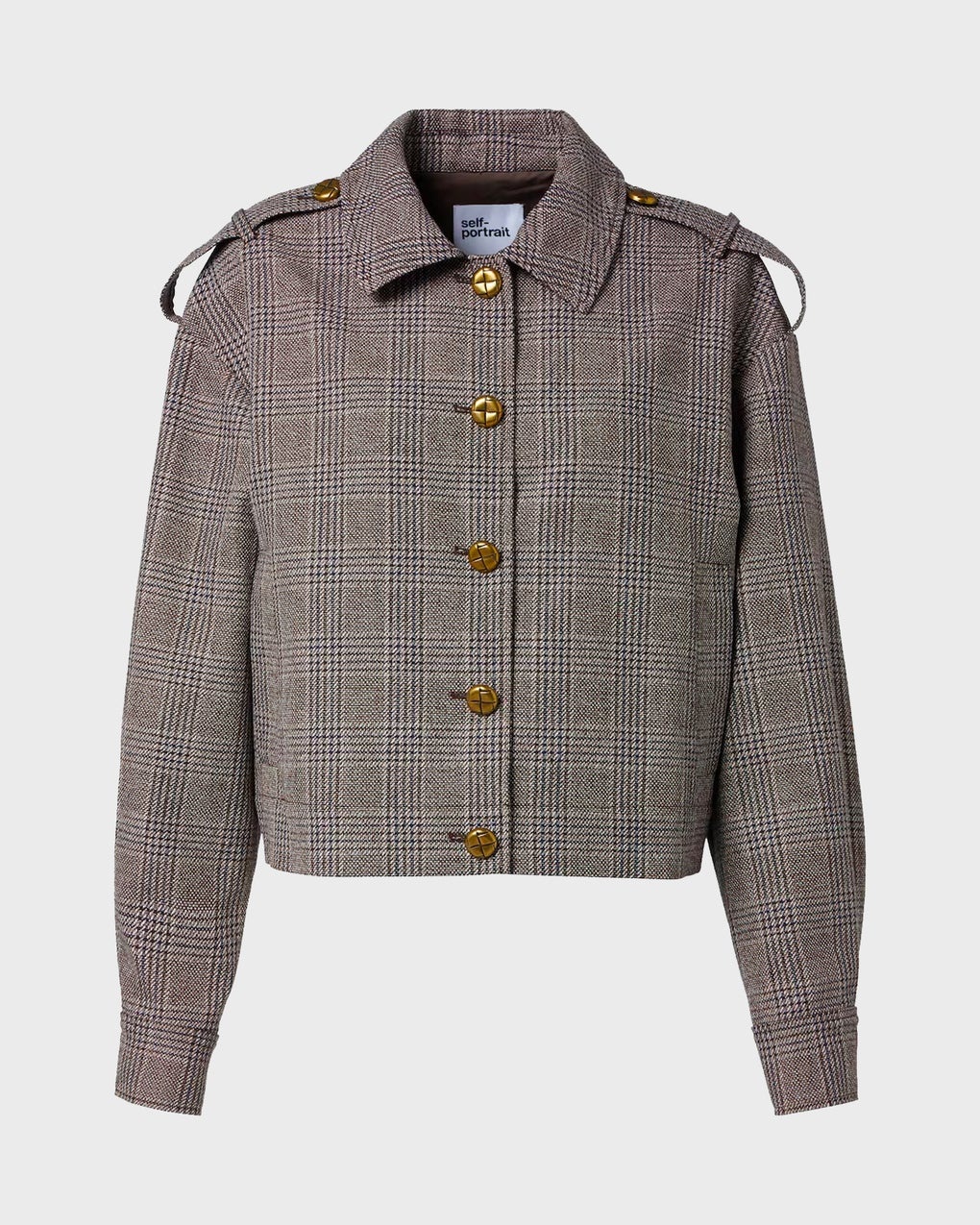Jacket Check from Self Portrait. This jacket exudes timeless elegance with its sleek check pattern, epaulettes, and gold buttons. The relaxed fit makes it perfect for layering – pair it with high-waisted jeans and a simple t-shirt for a sophisticated weekend look. The jacket features minimal stretch, a front button closure, and a functional internal pocket at the chest. For a complete style, a matching skirt is also available. Size and Fit - Fits true to size, choose your usual size - The model is 178 cm tall and is wearing size 4 Specification - Article number - ID: 175246-083 - Brand: Self-Portrait - Color: Brown - Washing Instructions: Kemtvatt - Made of: Main Fabric: 76% Cotton 24% Linen Lining: 100% Cupro