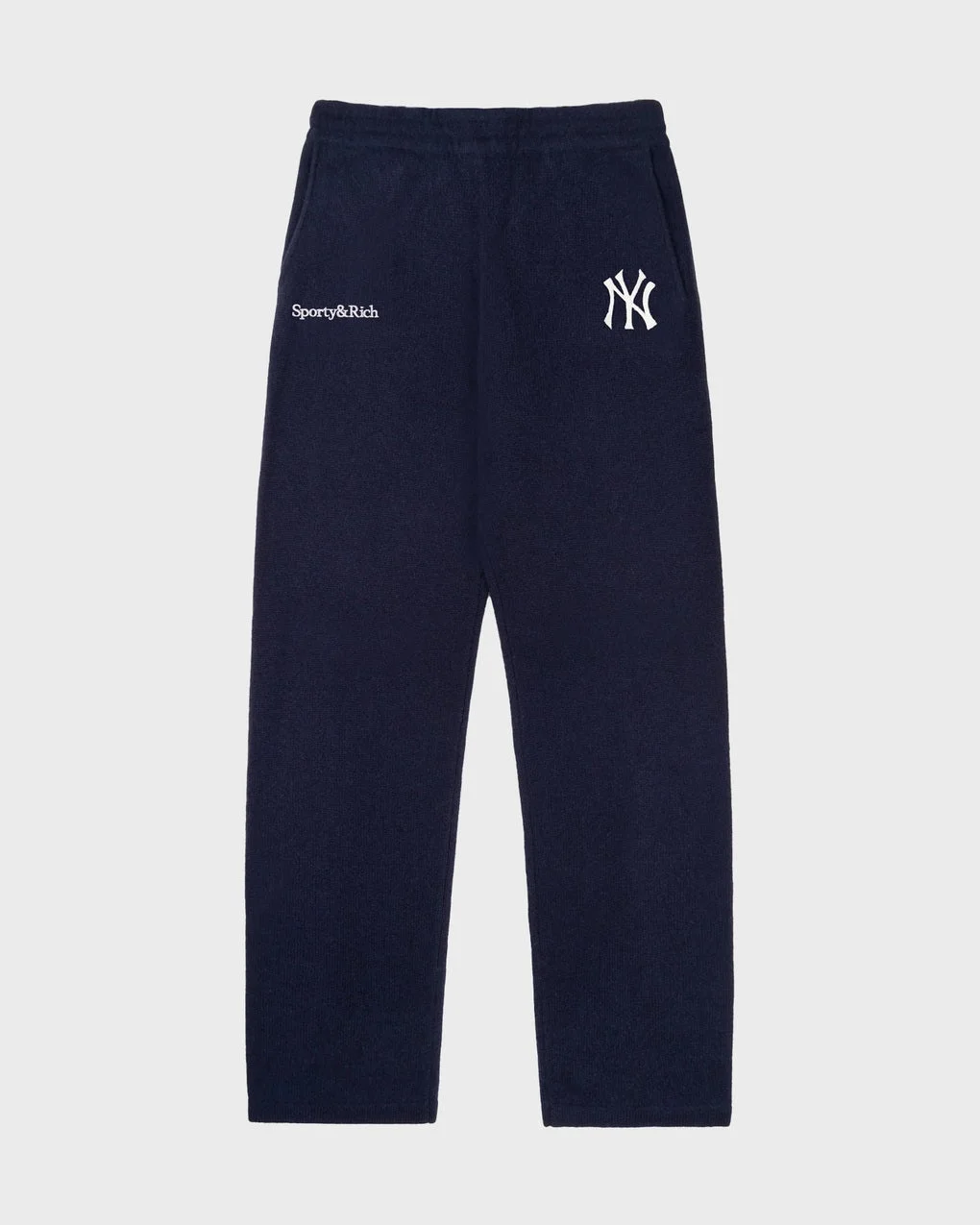 Pants Heritage Yankees Cashmere from Sporty & Rich. Luxurious trousers crafted from soft cashmere, offering an elevated take on classic sportswear. Designed with a relaxed, straight-leg silhouette and a comfortable elasticated waistband for effortless wear. Finished with the iconic Yankees logo and subtle Sporty & Rich branding for a refined yet laid-back look. Size and Fit - Fits true to size, choose your usual size - The model is 175 cm tall and is wearing size S Specification - Article number - ID: 176819-256 - Brand: Sporty & Rich - Color: Navy - Washing Instructions: Hand wash - Made of: 70% Cashmere, 30% Wool