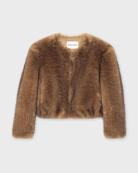 Karly Jacket from Stand Studio. A collarless faux fur jacket with defined shoulders, cut to a slightly oversized fit inspired by bomber jacket style. Features voluminous sleeves and a front zip closure. Size and Fit - Fits true to size, choose your usual size - The model is 176 cm tall and is wearing size 36 Specification - Article number - ID: 176637-097 - Brand: Stand Studio - Color: Natural - Washing Instructions: Dry clean - Made of: 100% Polyester