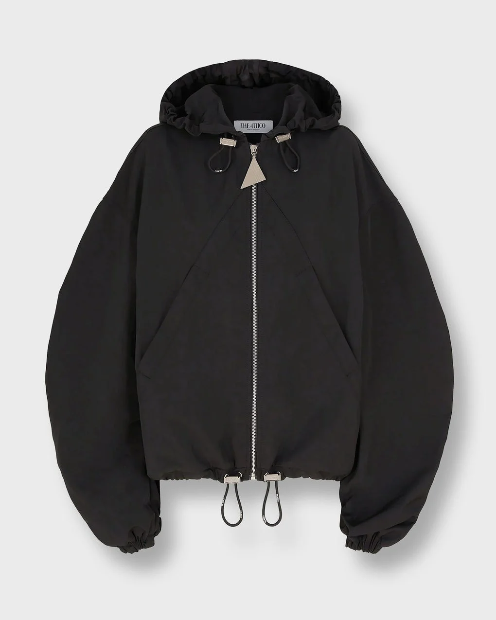 Jacket Bomber from The Attico. Elevate your look with this black nylon bomber jacket from The Attico. Made in Italy, it features a hood, patch pockets, and a logo metal zip puller. Crafted from 100% polyester with a 100% viscose lining for a smooth and comfortable feel. Size and Fit - Fits true to size, choose your usual size - The model is 175 cm tall and is wearing size 40 Specification - Article number - ID: 177326-000 - Brand: THE ATTICO - Color: Black - Washing Instructions: Dry Clean - Made of: 100% polyester, lining 100% viscose