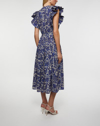 Dress Kairi Flutter Sleeve Midi from Ulla Johnson. A classic midi dress designed with short flutter sleeves and a breezy, voluminous skirt. Crafted from a soft cotton and viscose blend featuring subtle stripes and bold botanical prints inspired by vintage indigo textiles. The dress includes side seam pockets and a tie neckline that can be worn loose or knotted. Size and Fit - Fits true to size, choose your usual size Specification - Article number - ID: 176418-022 - Brand: Ulla Johnson - Color: Blue - Washing Instructions: Machine wash - Made of: 66% Cotton, 34% Viscose