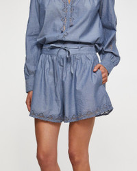 Shorts Elowen from Ulla Johnson. The Elowen Short is made from soft, water-washed poplin in a delicate blue for optimized versatility. This breezy style is adorned with geometric tonal embroidery and tulle appliques at the hem that play with transparency. Designed to sit high at the waist with a removable belt, it features side pockets and fastens with a concealed side zipper. Size and Fit - Fits true to size, choose your usual size - The model is 176 cm tall and is wearing size US 4 Specification - Article number - ID: 176423-020 - Brand: Ulla Johnson - Color: Light blue - Washing Instructions: Hand wash or dry clean - Made of: 100% Cotton