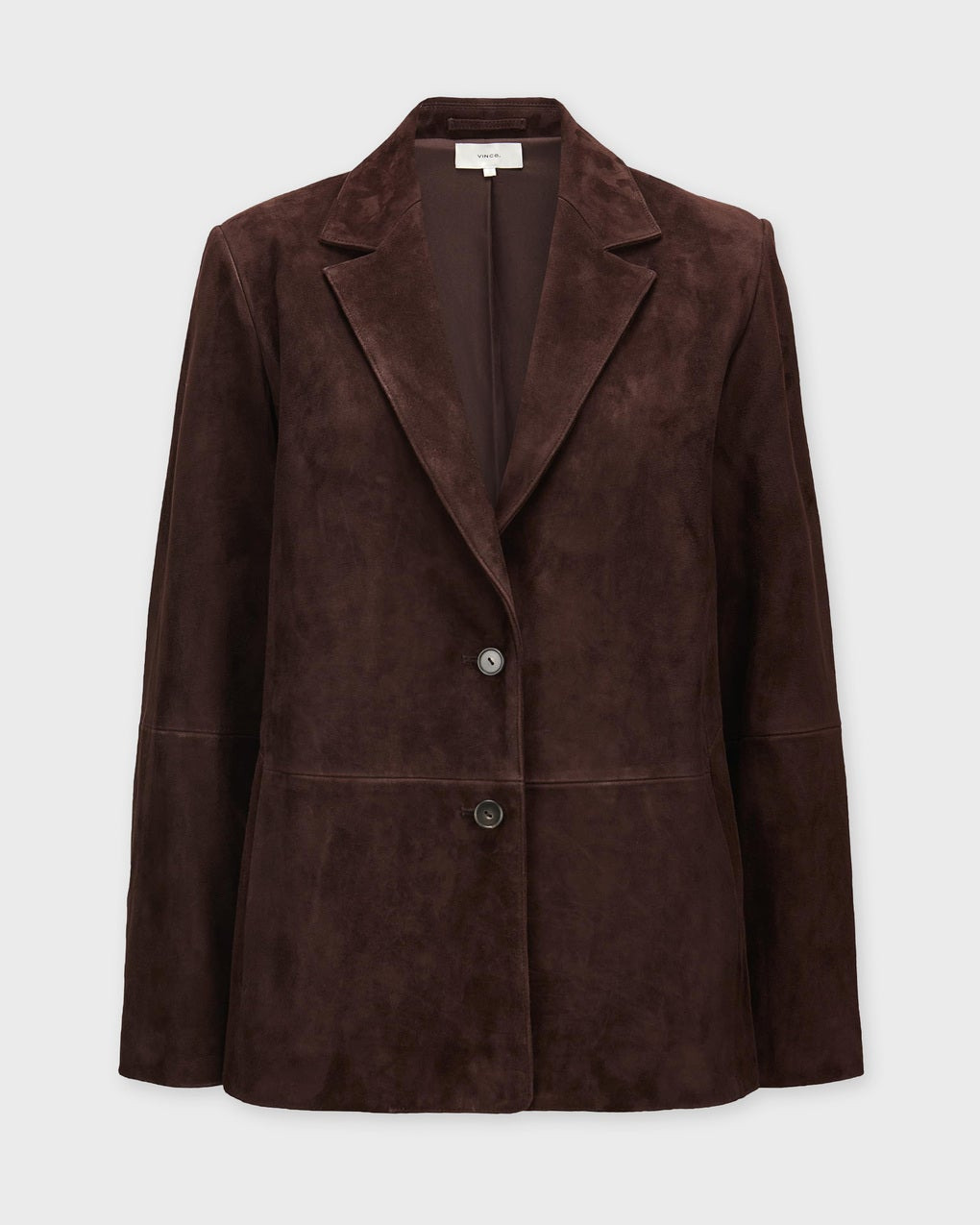Suede Blazer from Vince. Tailored with a boxy, oversized fit and padded shoulders, our best-selling buttery suede blazer returns this season in a rich chocolate brown hue. Made of 100% goatskin suede. Size and Fit - Fits true to size, choose your usual size - The model is 176 cm tall and is wearing size 4 Specification - Article number - ID: 176212-950 - Brand: Vince - Color: Chocolate - Washing Instructions: Dry clean only. - Made of: 100% Goatskin Suede