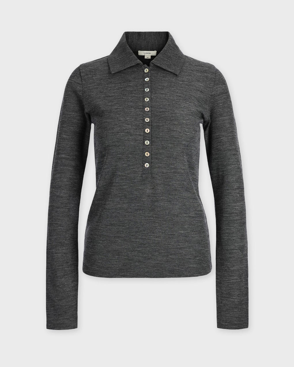 Long Sleeve Polo Top from Vince. A long-sleeve top crafted from 100% wool, featuring a classic polo collar and front button placket. With its sleek and timeless design, it’s easy to style for both casual and more elevated occasions. Size and Fit - Fits true to size, choose your usual size - The model is 176 cm tall and is wearing size S Specification - Article number - ID: 176643-091 - Brand: Vince - Color: Grey - Washing Instructions: Hand wash - Made of: 100% Wool