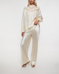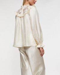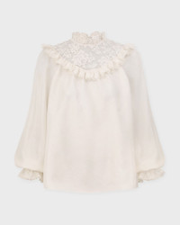 Lace Billow Blouse by Zimmermann. A romantic and elegant blouse in a soft beige tone, trimmed with frothy lace for a dreamy, ethereal feel. The delicate design is enhanced with modern touches, creating a stylish yet feminine look – perfect for both everyday wear and special occasions. Size and Fit - Fits true to size, choose your usual size - The model is 176 cm tall and is wearing size 1 Specification - Article number - ID: 176993-081 - Brand: Zimmermann - Color: Cream - Washing Instructions: Dry clean - Made of: 100% Silk