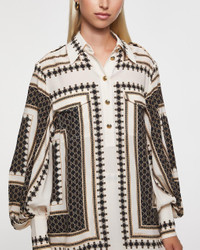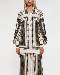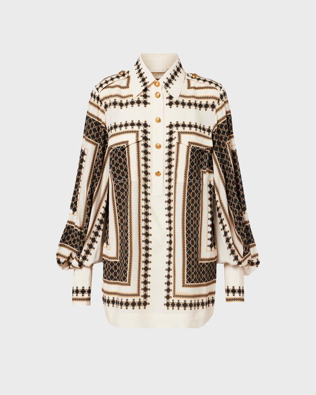 Pocket Shirt from Zimmermann. A relaxed and stylish shirt featuring elegant gold-toned buttons down the front for a refined touch. Designed with chest pockets and voluminous sleeves, it offers a modern and airy silhouette. Perfect for both casual and elevated looks – pair it with the matching trousers for a complete outfit. Size and Fit - Fits true to size, choose your usual size - The model is 176 cm tall and is wearing size 1 Specification - Article number - ID: 176996-611 - Brand: Zimmermann - Color: Print - Washing Instructions: Dry clean - Made of: 55% viscose, 45% silk