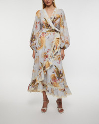 Ascension Frill Midi Dress from Zimmermann. An elegant midi dress designed with a tropical floral pattern. The dress is made of cotton and features a deep V-neckline, long puff sleeves with elasticated cuffs, and a self-tie belt at the waist, finished with frill detailing. Size and Fit - Fits true to size, choose your usual size - The model is 172 cm tall and is wearing size 1 Specification - Article number - ID: 176191-020 - Brand: Zimmermann - Color: Light blue - Washing Instructions: Dry clean - Made of: 100% cotton
