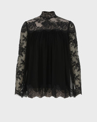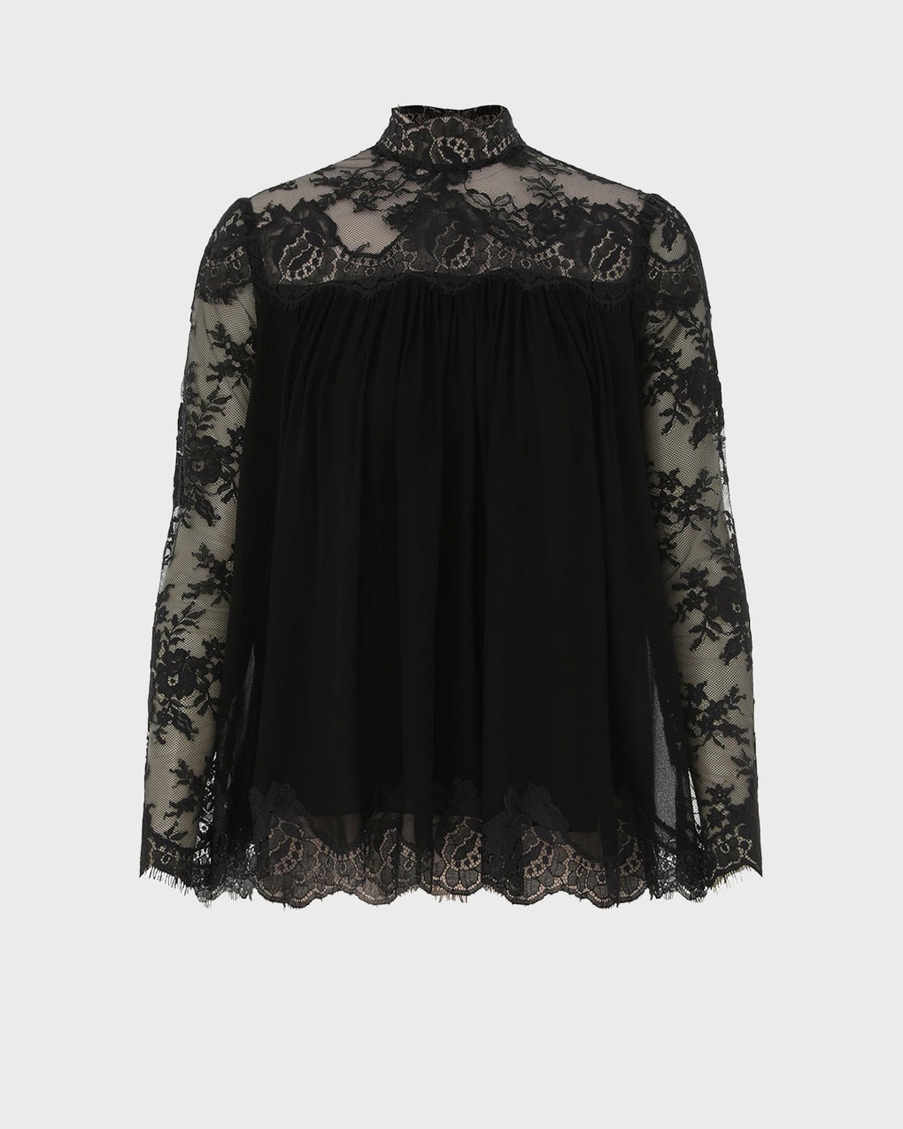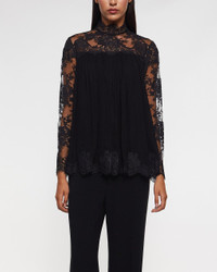 Top Hypnotic Lace Yoke by Zimmermann. An elegant long-sleeve top featuring sheer lace across the shoulders and sleeves, a high lace collar, and gathered detailing at the bust. Designed with a scalloped lace stand collar, a concealed zip at the back, and lace trim at the cuffs and hem. A feminine and sophisticated piece with romantic touches, perfect for evening wear and special occasions. Specification - Article number - ID: 176999-000 - Brand: Zimmermann - Color: Black - Washing Instructions: Dry clean - Made of: 100% viscose; lace: 56% cotton, 44% polyamide