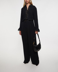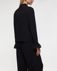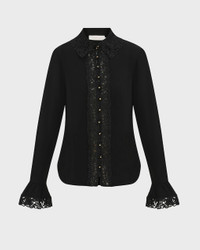 Lace Trim Shirt by Zimmermann. A fitted long-sleeve shirt featuring a classic collar and decorative frilled cuffs. The shirt has functional buttons down the entire front and is elegantly adorned with lace trim at the collar, placket, and cuffs. A sophisticated piece with romantic details, perfect for both everyday wear and special occasions. Size and Fit - Fits true to size, choose your usual size Specification - Article number - ID: 176994-000 - Brand: Zimmermann - Color: Black - Washing Instructions: Dry clean - Made of: 100% viscose