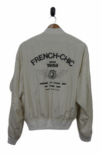 B2 Step into timeless style with this rare vintage bomber jacket by JUN MEN, a revered Japanese menswear brand known for its elegant tailoring and youth-driven fashion since 1958. Features: Color: Off-white / Ivory Material: Lightweight nylon with ribbed hem and cuffs Front zip closure with utility-style sleeve pocket Back print: “FRENCH-CHIC Since 1958” with winged emblem Front embroidered patch with the JUN MEN logo Tagline: “Designed by Young Men for Young Men” Inner label reads “JUN MEN – Progressing Since 1958” Two buttoned flap pockets and zip arm pocket Made in Japan Condition: Very good vintage condition. Some signs of age and gentle wear, consistent with vintage pieces. No major flaws. Size: Fits like a Medium (check measurements if possible) Tag Size :- M (All measurements were taken lying flat) Actual size Manual Measurement (approximately) : UNDERARM TO UNDERARM :- 24 inches LENGTH (Top Shoulder to hem) :- 25 inches Condition: An item that has been used or worn previously. See Our listing for full details and description of any imperfections. Please don't expect it to be like new Kindly see all pictures Thank you so much for your visit PAYMENT And SHIPPING: ¦Accept "PAYPAL" Only ¦This item will be ship along with Tracking Number after received a completed payment. all item will be shipped within 2-3 days after receive clear payment. post via international registered/signed for with tracking number. Please drop your contact no. after purchasing the item(s). This is important for the shipping purpose. -PLEASE MAKE SURE YOUR ADDRESS IS COMPLETE AND CORRECT. -KINDLY LEAVE YOUR PHONE NUMBER FOR REFERENCE. Etc: Don't Worry About Customs Tax or Fees. I usually Declare all Items as 'Gift' & Declare Value of Item Lower than Original Price. All Items are Sold "AS IS" so Please be Sure to Read The Entire Description and Look at All The Pictures. Any Question and More Details Please Don't Hesitate to Contact Me. ATTENTION : Please pay close attention to measurements provided. Do not rely on tag size as pre-worn items may have been altered, stretched or shrunk & vintage sizes do not directly translate the modern sizes.The best way to ensure a correct fit is to compare our measurements with the measurements of a similar item that you know fits you well.Please enlarge the photos for clearer image