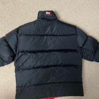 Vintage Mens 90s Polo Sport Down Puffer Jacket Black And Red Tag size L chest measures 22 inches 25 inch length #thrift #y2k #carhartt #polo #vintage