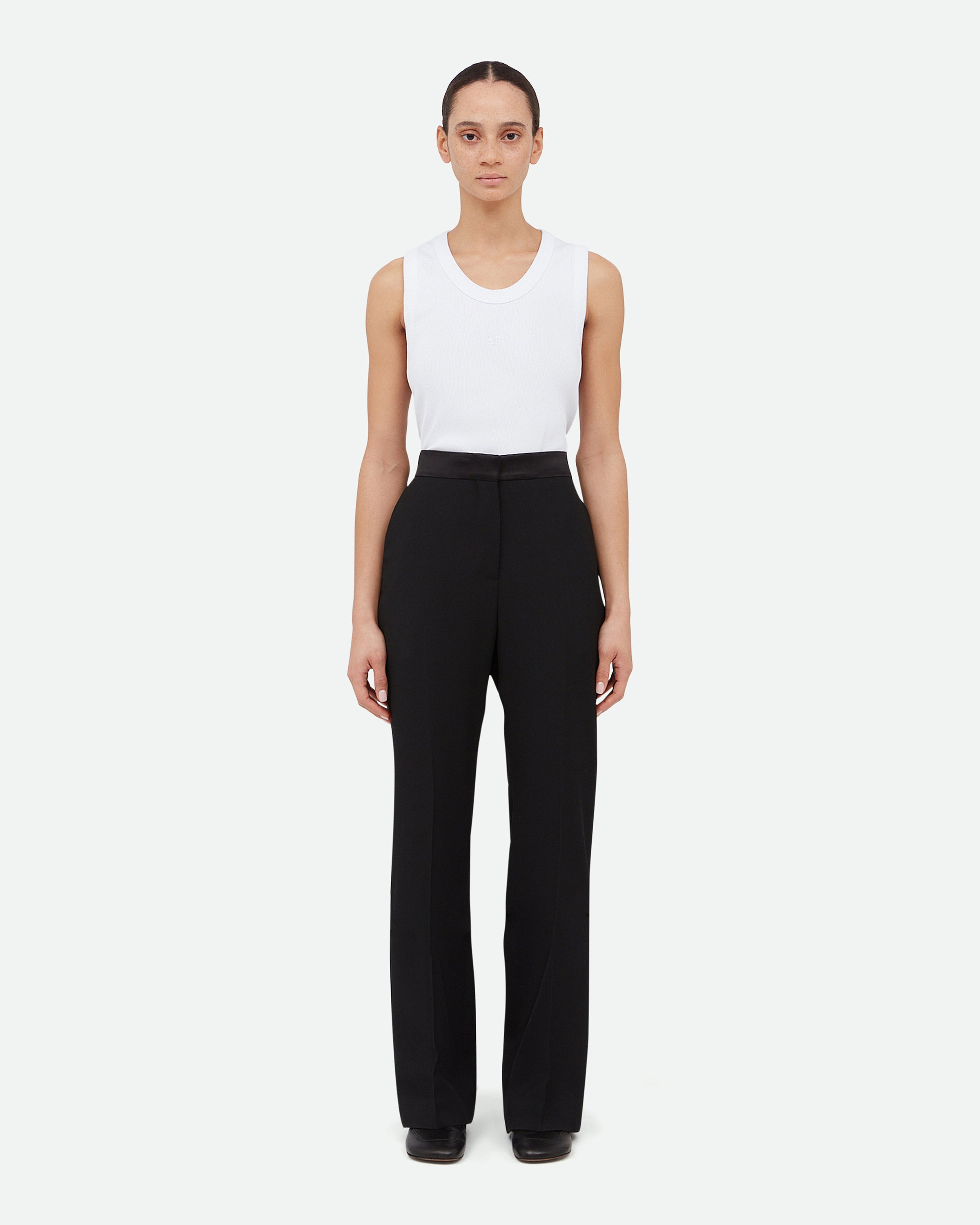 The Harmony Tailored Trousers Tuxedo trouser made in Italy from wool grain de poudre with a black satin waistband. - Viscose Lining - Satin Waistband - 100% Virgin Wool