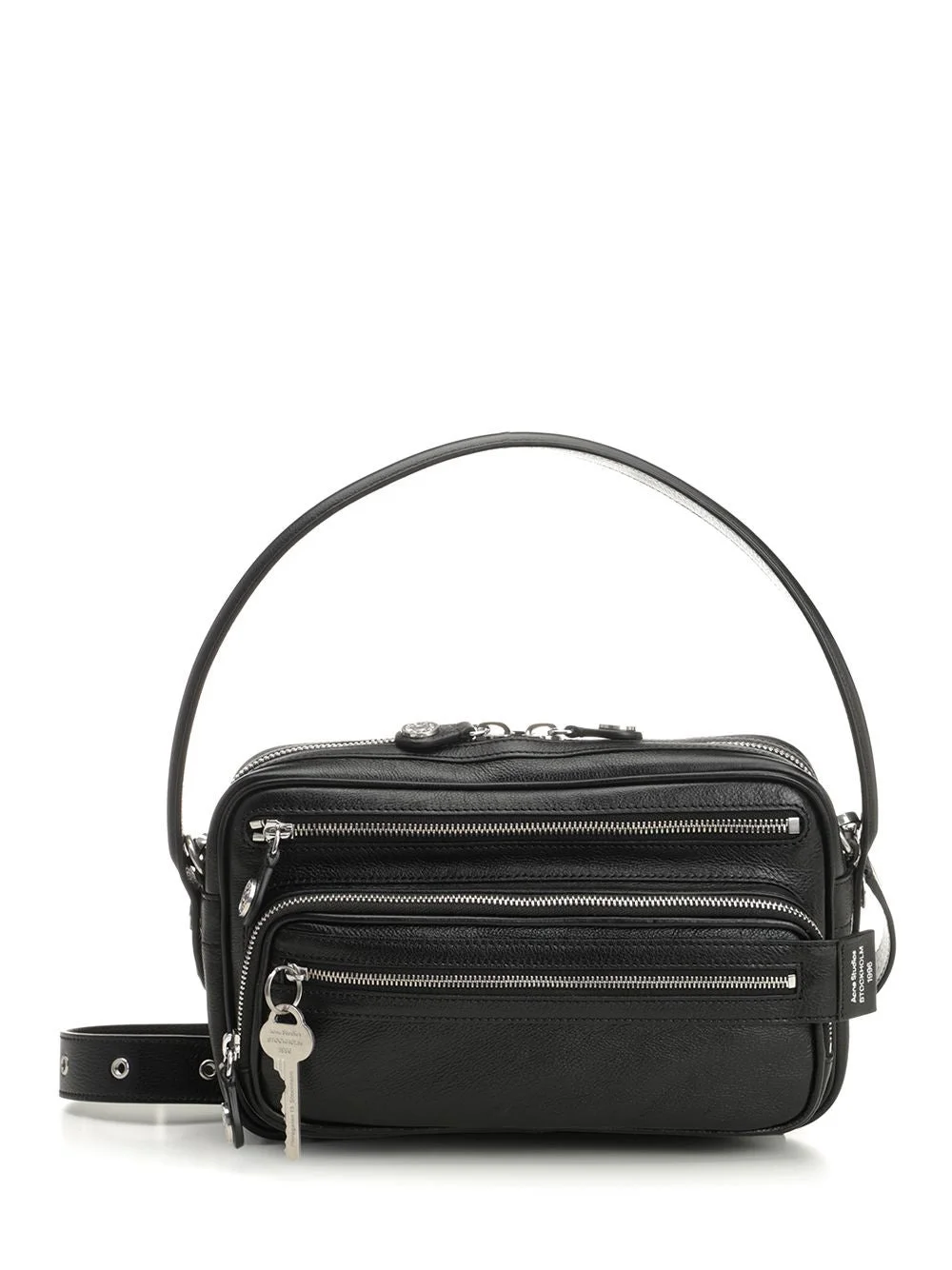Drop handle and adjustable crossbody strap Acne Studios logo embossed Silver-toned zip compartments and denim-style buttonBranded key charm Measurements: 280mm; 420mm; 110mm Drop handle measurements: 8cm, max Crossbody strap measurements: Adjustable 42 cm to 65 cm - Colour: Black - Composition: Shell: 100% Calf leather, Lining: 50% Polyurethane, 50% Polyester - Country Of Manufacture: IT - Dimension: W.27 X H.17 X D.10 cm - MPN: C10240900