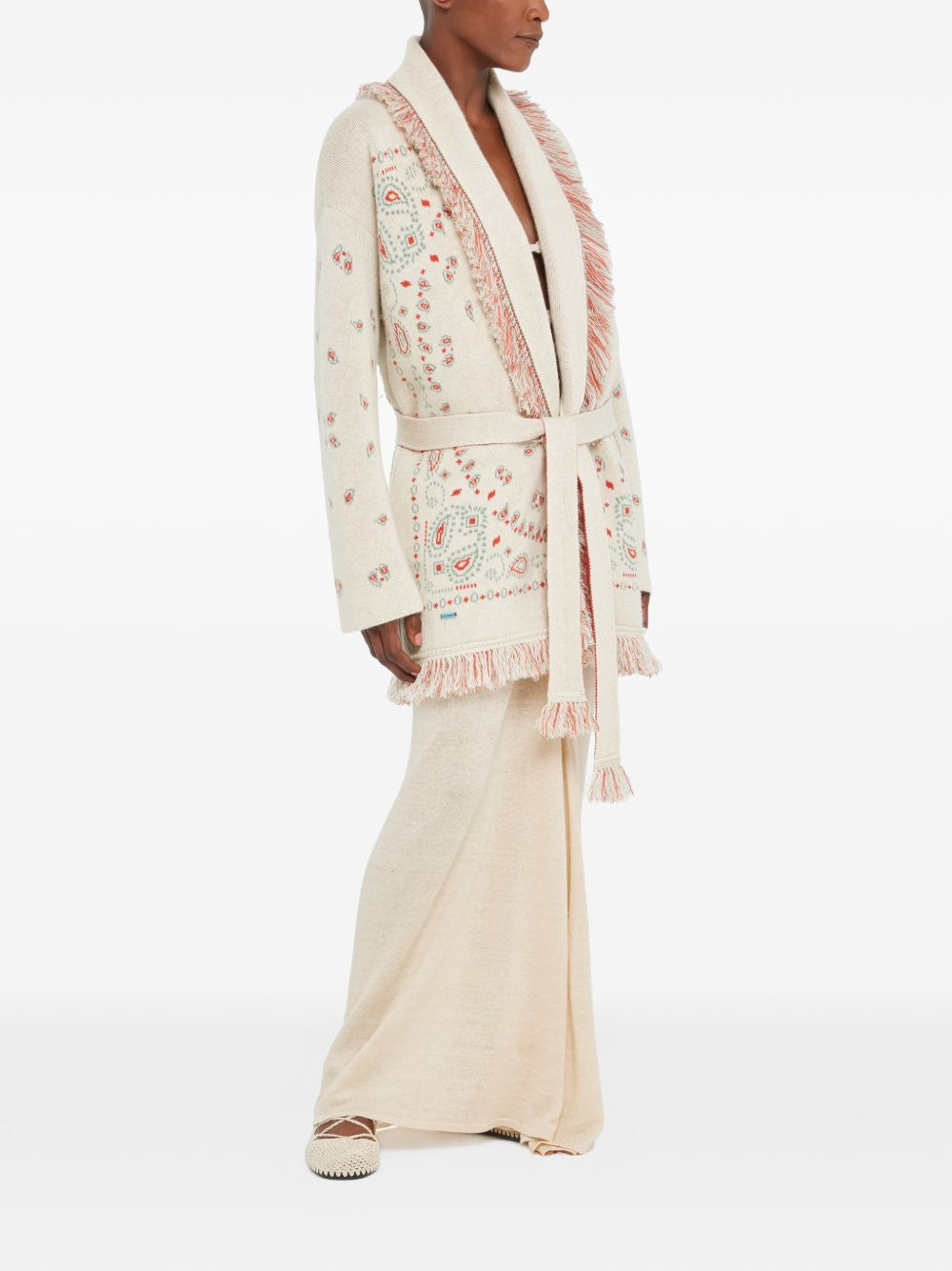 white jacquard knit shawl lapels fringed trim self-tie belt - Colour: Light and natural - Composition: Wool or fine animal hair->Cashmere67.0 % Natural (Veg)->Linen/Flax33.0 % Natural (Veg)->Cotton100.0 % - Country Of Manufacture: ITALY - MPN: LWHB064R26KNI031OF84