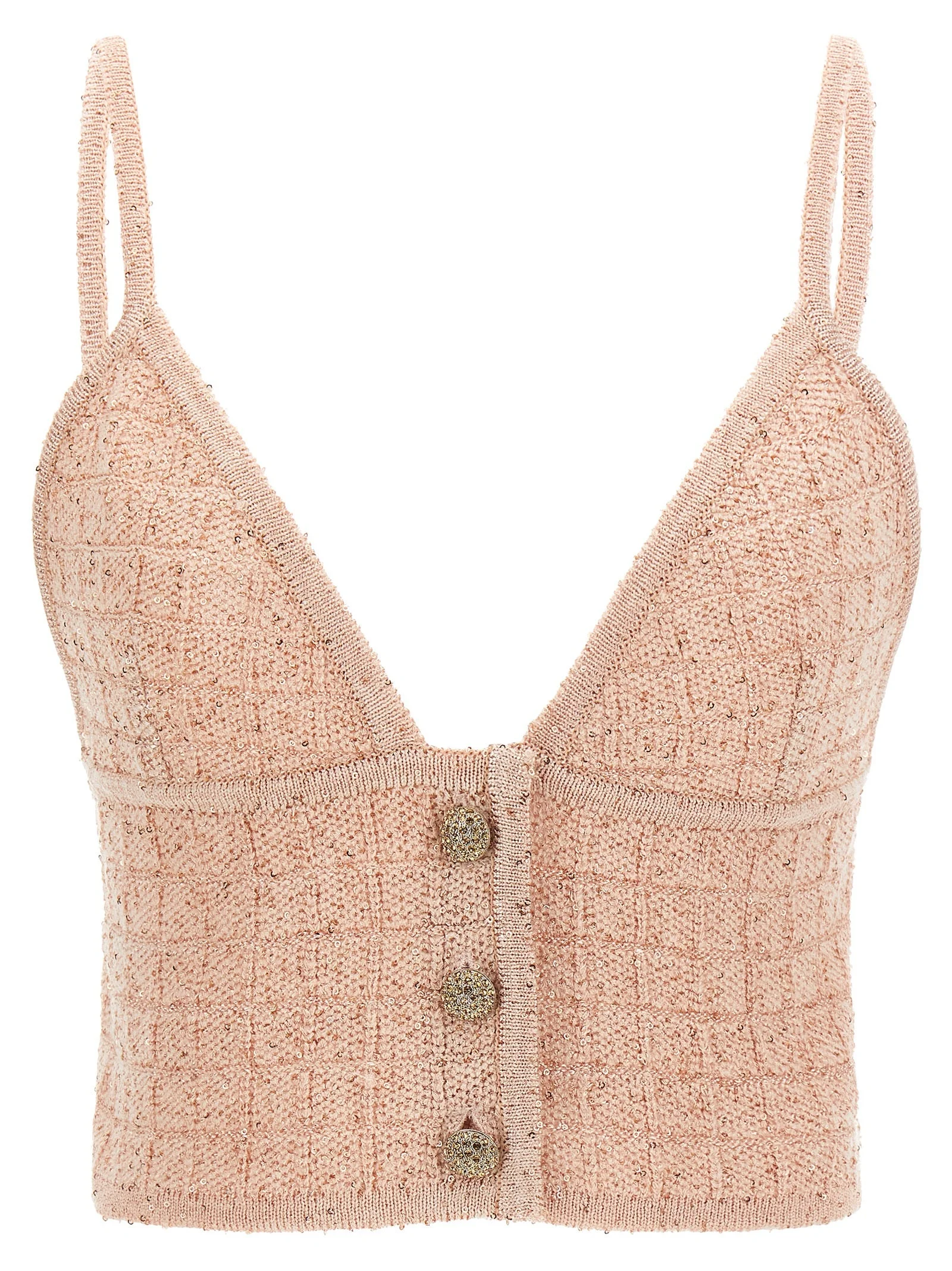 Knitted wool blend top with all-over micro sequin applique, triangle crop pattern, front snap jewel button closure, thin straps. - Colour: Pink - Composition: 77% polyester, 23% merino wool - Country Of Manufacture: Italy - Dimension: true to size fit - MPN: FABX4352K47227674