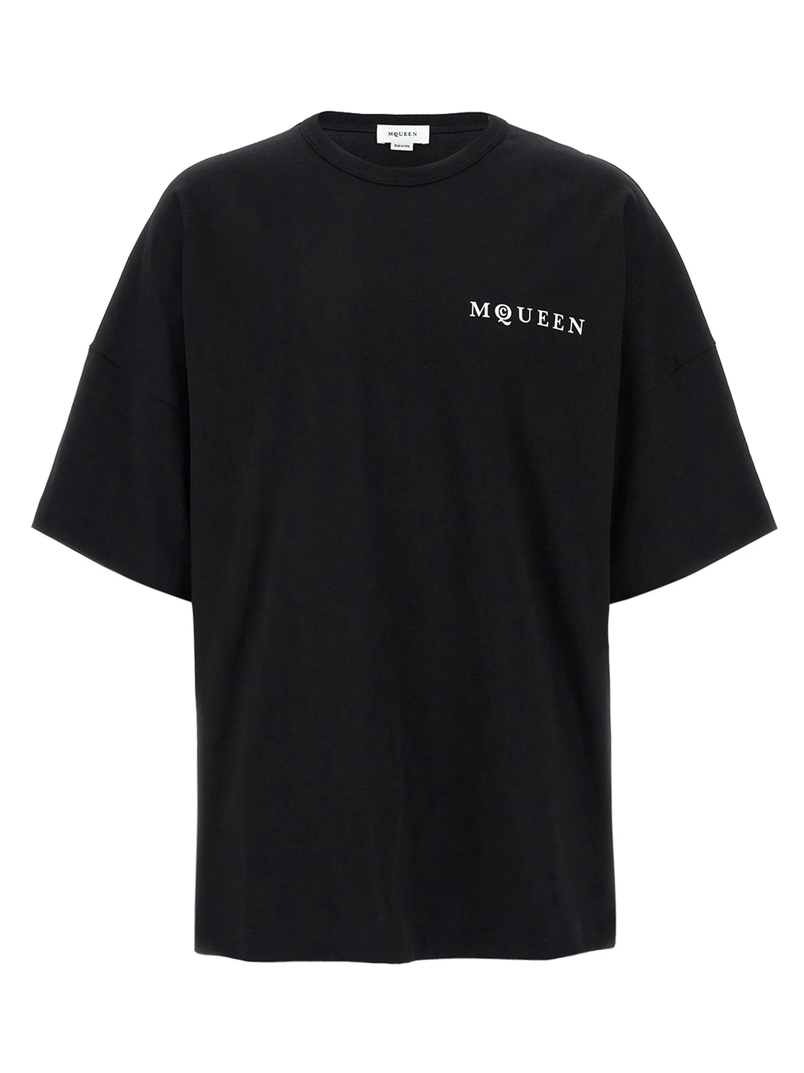 Cotton jersey T-shirt with 'McQueen' logo print on the front and back, crew neck, short sleeves with dropped shoulders. - Colour: White/Black - Composition: 100% cotton - Country Of Manufacture: Italy - Dimension: oversized fit - MPN: 828434QTADE0520