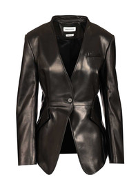 McQueen tailored leather jacket featuring a V-neck, fitted waist, side flap pockets and a ruffle detail at the back, and a single button fastening. - Colour: Black - Composition: Lamb skin DOMESTIC BUFFALO - Country Of Manufacture: IT - MPN: 840138Q5AML1000