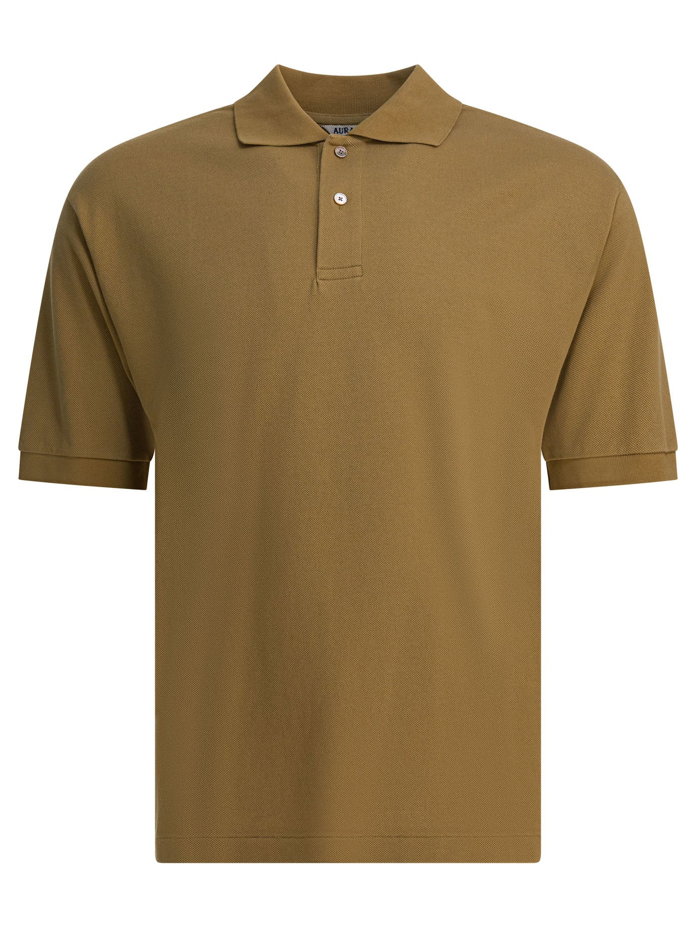 Auralee heavy cotton polo shirt, made of dense-spun Pima cotton pique knit. The fabric undergoes a salt shrinkage treatment that gives structural rigidity and surface strength. The silhouette remains compact and defined thanks to the solid construction, which respects minimal lines and an essential structure, enhancing the textural texture of the selected cotton. - Solid color - Short sleeves - Pima cotton pique knit with dense spinning - Front button closure - Classic collar - Regular fit - Colour: Beige - Composition: 100% cotton - Country Of Manufacture: Japan - Extra Description: Solid colourRegular fit;Short sleeves - MPN: A25SP01SKKHAKIBEIGE