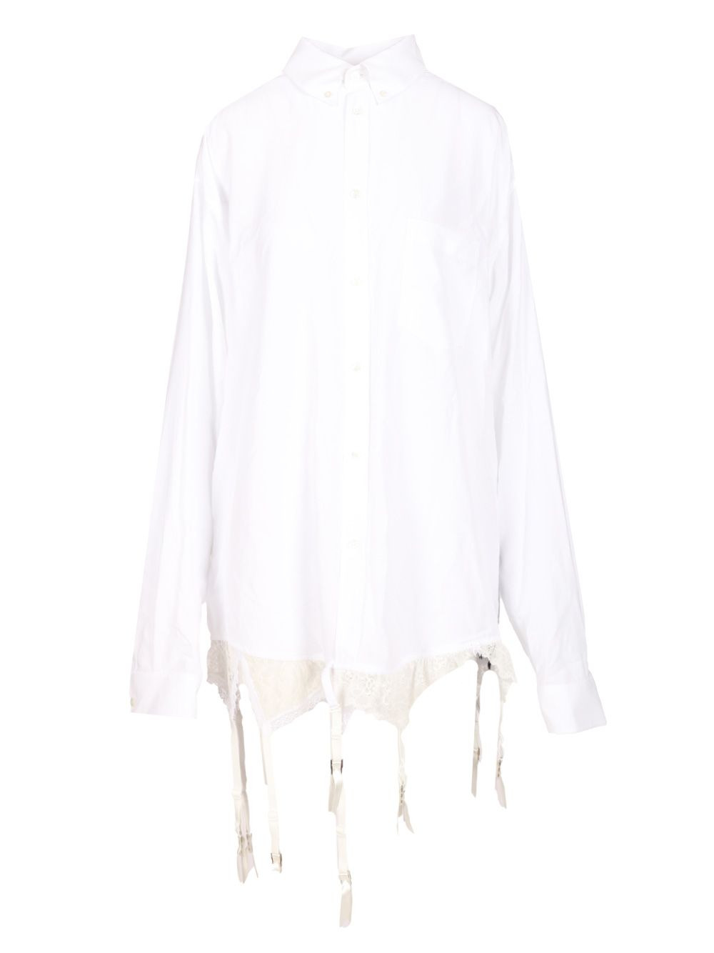 Lingerie shirt in fluid cellulose poplin by Balenciaga, with buttoned collar, 6 buttons on the front, patch pocket on the chest, long sleeves, buttons on the cuffs and lingerie details on the bottom - Colour: White - Composition: T1 LYOCELL 100% T2 VISCOSE 41% T2 POLYAMIDE 39% T2 ELASTAN 20% - Country Of Manufacture: IT - MPN: 831656TRO379000