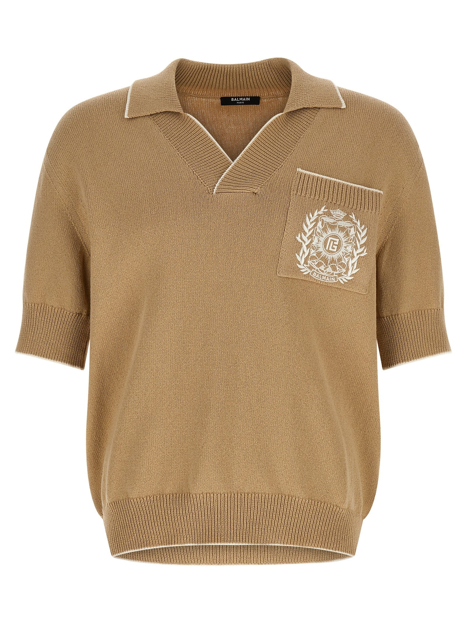 Cotton knit polo shirt with contrast piping, collar, V-neck, breast pocket with 'Balmain Stemma' embroidery, short sleeves with cuffs. - Colour: Beige - Composition: 44% cotton 44% lyly 12% polyamide - Country Of Manufacture: France - Dimension: Comfort fit - MPN: FH1GB049KI76GMP