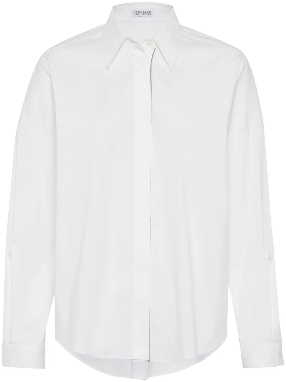 white cotton blend poplin texture bead embellishment classic collar concealed front button fastening long sleeves buttoned cuffs rear curved hem - Colour: Light and natural - MPN: M0091MA636C159