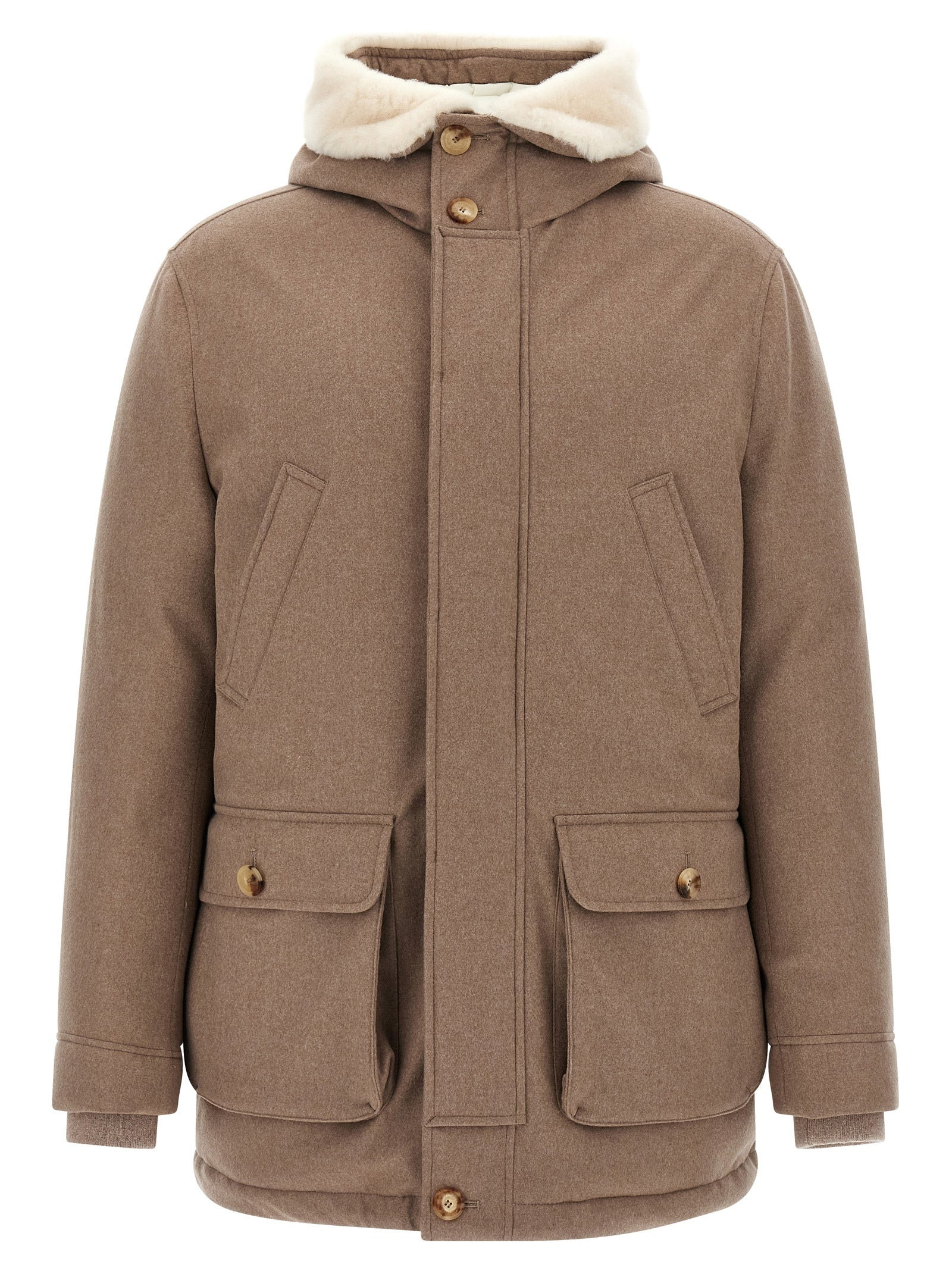 Padded and quilted membrane wool flannel down jacket, shearling-lined high neck, 4-pocket parka style, front zip closure, long sleeves with knitted cuffs. - Colour: Beige - Composition: 100% wool - Country Of Manufacture: Italy - Dimension: True to size fit - MPN: MM4701993CHC81