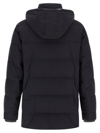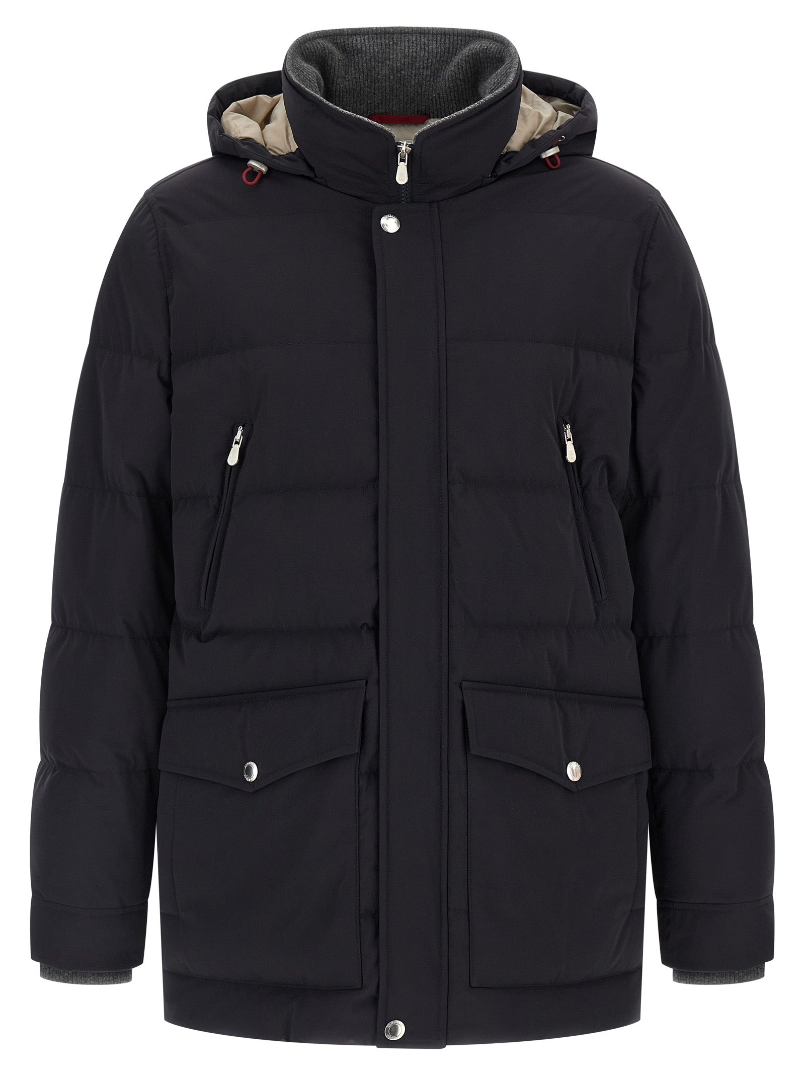 Quilted tech fabric jacket with water-repellent goose down padding with ribbed cotton knit inserts, adjustable and removable hood, standing collar, front zip and snap button closure, pockets, long sleeves with elastic cuffs, adjustable slits with back snap buttons. - Colour: Blue - Composition: 87% polyamide, 13% elastane - Country Of Manufacture: Italy - Dimension: true to size fit - MPN: MM4911823CFV83