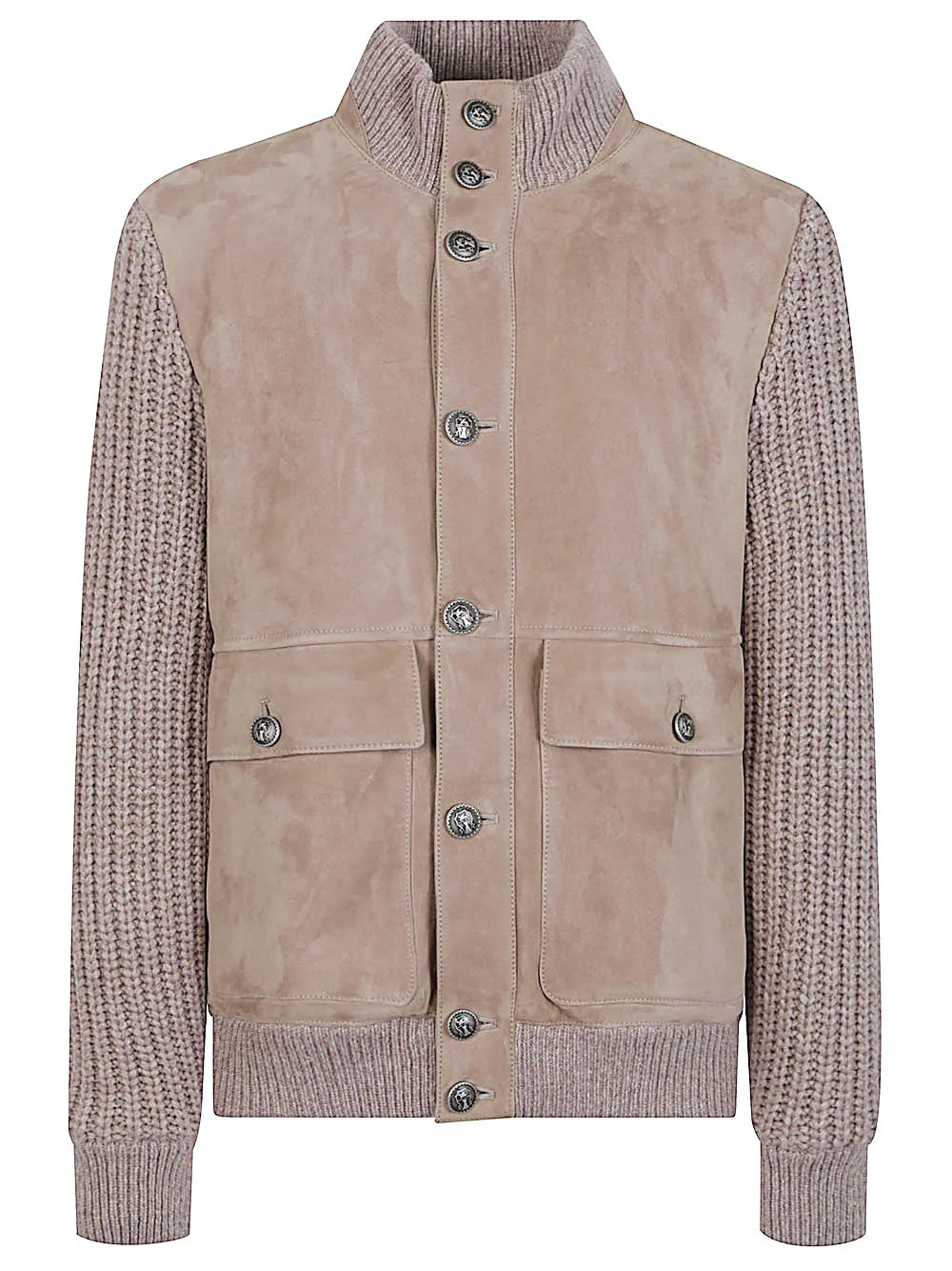 Beige suede bomber jacket, long knitted sleeves, button fastening, high collar and ribbed hem, knitted back. - Colour: Light and natural - Composition: Leather 100% - Country Of Manufacture: Italy - MPN: MPMVS2060CYQ48