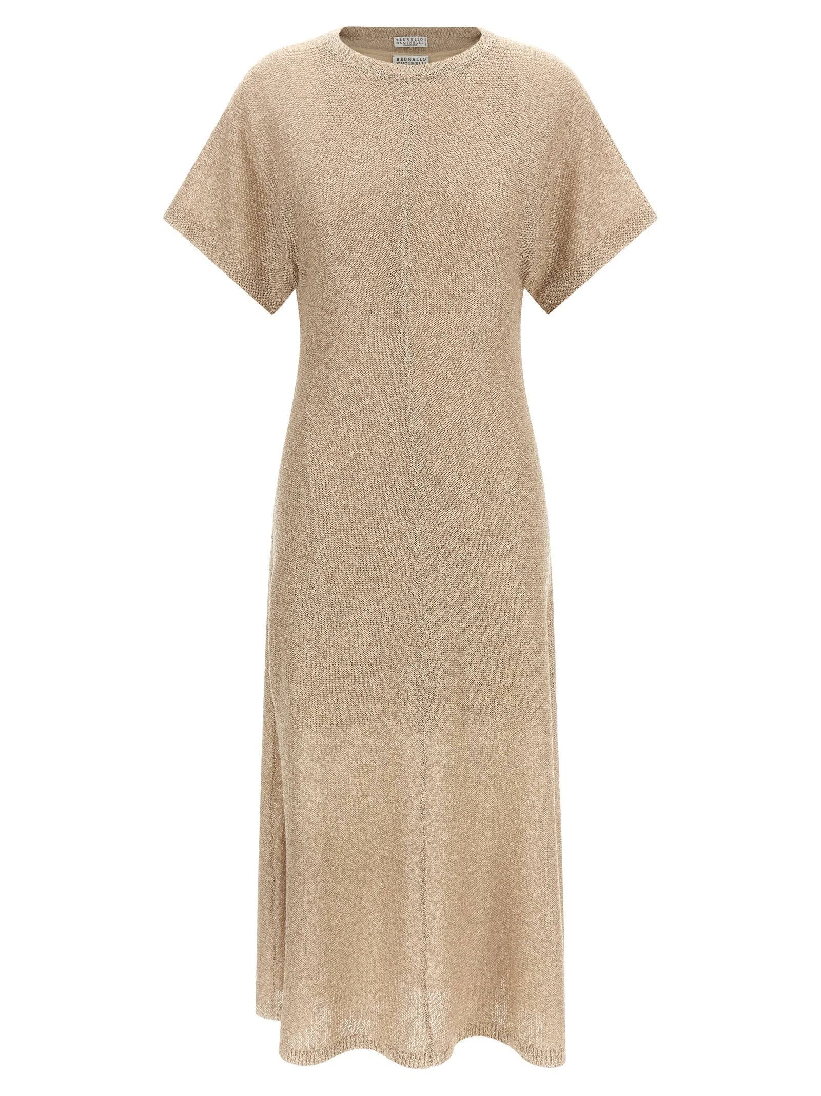 Long dress in linen, cashmere and silk blend with all-over sequin applique, round neckline, short sleeves, flared skirt, and removable petticoat. - Colour: Beige - Composition: 60% li, 28% ws, 12% se - Country Of Manufacture: Italy - Dimension: true to size fit - MPN: MDJ560A90C9589