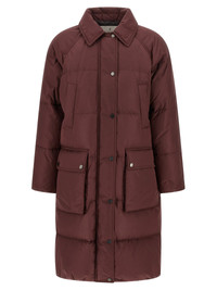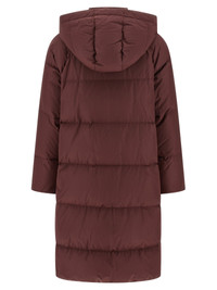 Long down jacket in quilted technical fabric padded with water-repellent goose down, removable hood, shirt collar, zip closure with 'Shiny Zipper Pull' monile zipper puller and front snap buttons, pockets, long sleeves with elastic cuffs, drawstring on the hem. - Colour: Bordeaux - Composition: 55% polyester, 45% cotton - Country Of Manufacture: Italy - Dimension: true to size fit - MPN: MG5019946CFS36