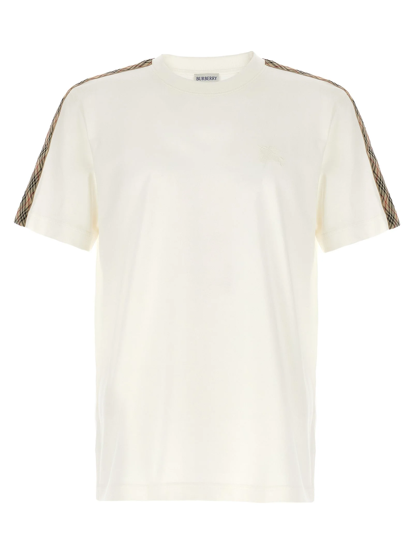 Cotton jersey T-shirt with tone-on-tone Equestrian Knight Design embroidery on the front, crew neck, short sleeves with Burberry Check ribbons. - Colour: White - Composition: 100% cotton - Country Of Manufacture: Vietnam - Dimension: Slim fit - MPN: 8106246CHALK