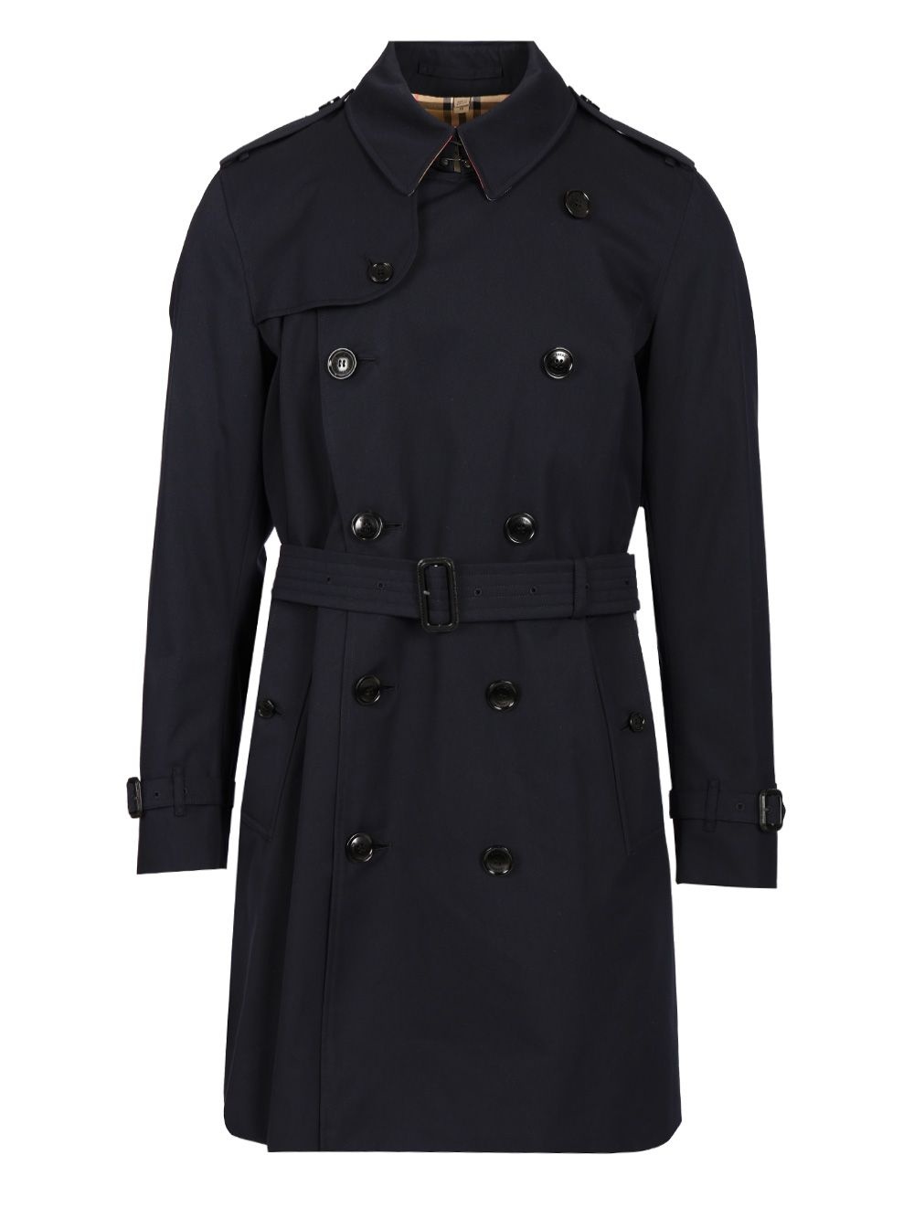 Burberry "The Kensington" medium trench coat in blue cotton, double-breasted fastening, buttoned welt pockets, narrow shoulders, tapered waist, hook-and-eye collar, storm flap, belted cuffs, D-ring belt, tartan undercollar, storm flap. - Colour: Blue - Composition: 100%COTTON - Country Of Manufacture: GB - MPN: 8079387B1488