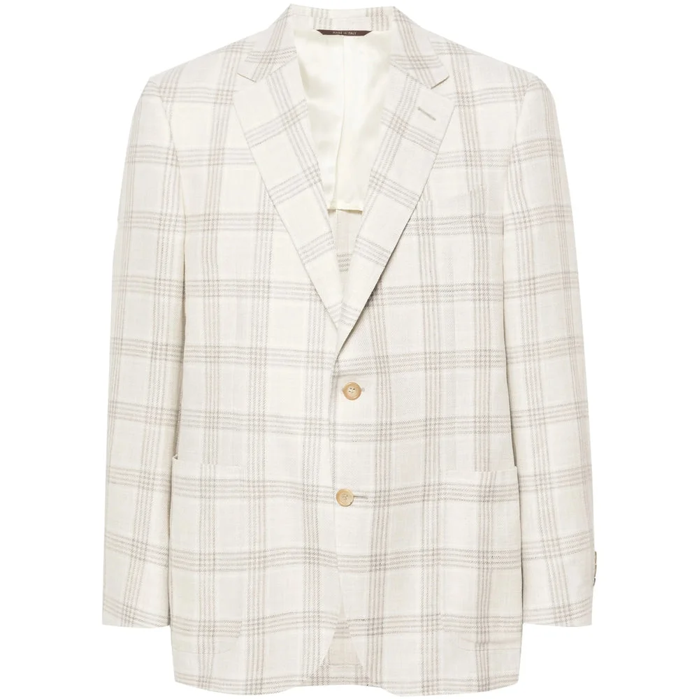 ivory white/grey linen-wool blend plaid check pattern twill weave notched lapels long sleeves with buttoned cuffs chest welt pocket two side patch pockets English rear vents multiple internal slip pockets internal logo patch curved hem front button fastening - Colour: Neutral - Composition: Outer Composition Linen/flax: 60.0%, Lining Composition Cupro: 100.0%, Outer Composition Wool: 40.0% - Country Of Manufacture: Italy - MPN: CF0200521288706 - Size Family: IT
