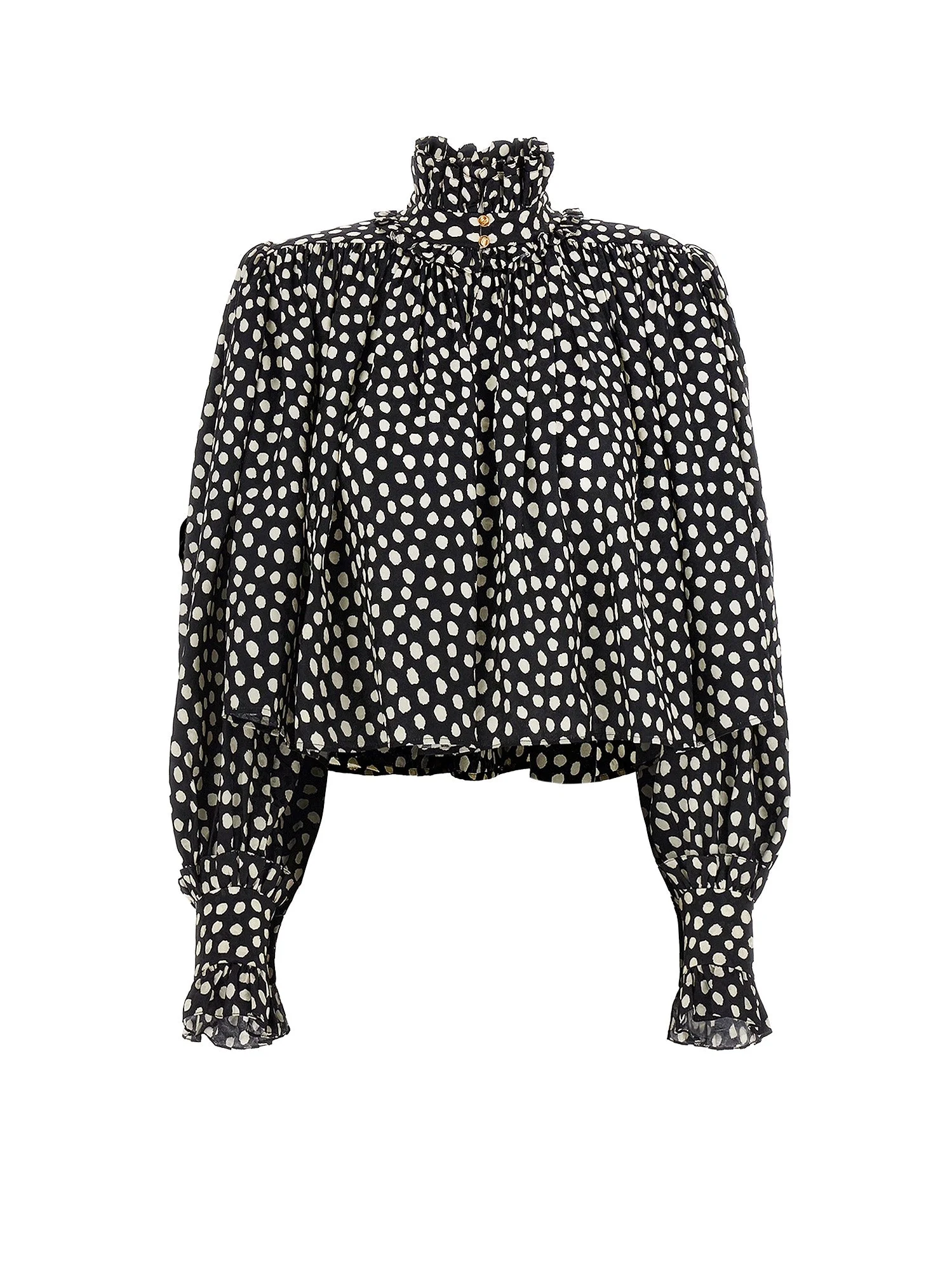 Closure with gold metal buttons Ruffled trim Long sleeves with ruffled cuffs Padded shoulders 100% silk SKU: CH26SHT90300915 - Colour: Black - Beige 1 - Composition: 100% seta - Country Of Manufacture: MADAGASCAR - MPN: CH26SHT90300915