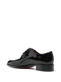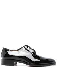 black calf leather patent finish front lace-up fastening low stacked heel grosgrain ribbon trim metallic detail to the front almond toe branded leather insole signature red sole - Colour: Blacks and greys - Composition: Calf Leather 100% - MPN: 3230589BK01