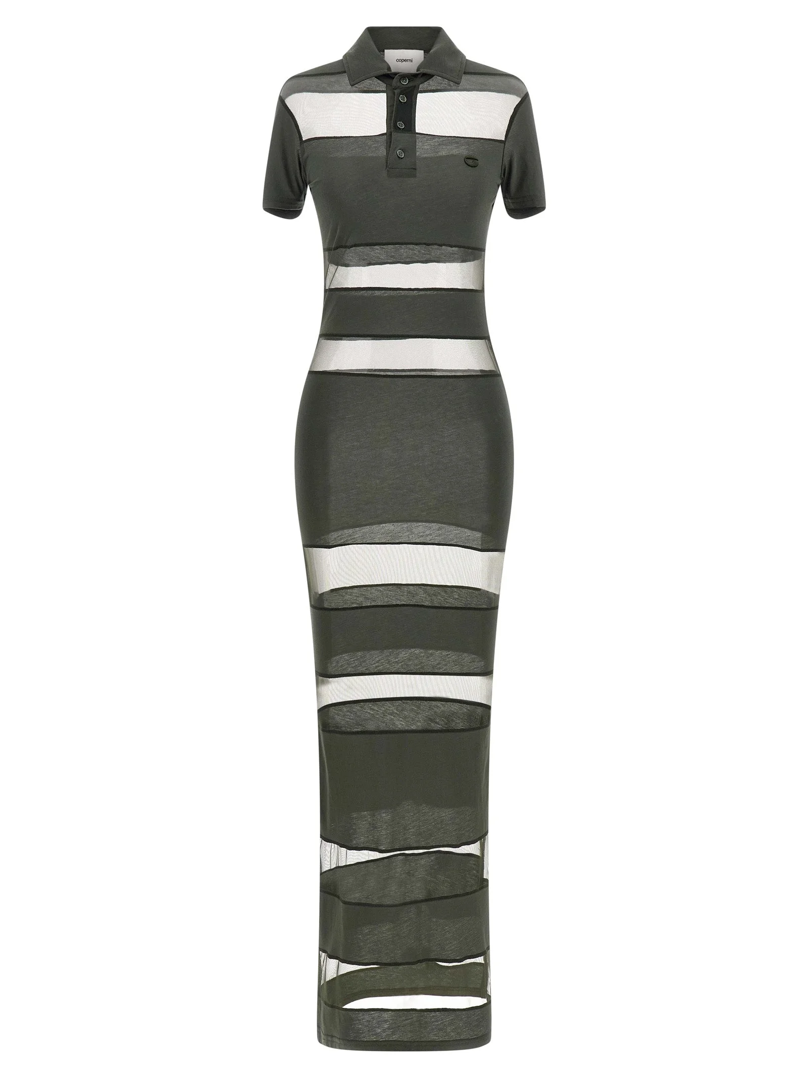 Long 'Striped Sheer Polo' dress in stretch technical fabric with alternating opaque and transparent stripes, tone-on-tone logo embroidery on the front, collar and buttons, short sleeves, side split. - Colour: Green - Composition: 50% cotton 41% polyamide 9% elastane - Country Of Manufacture: Portugal - Dimension: true to size fit - MPN: COPJS114F5028GRN