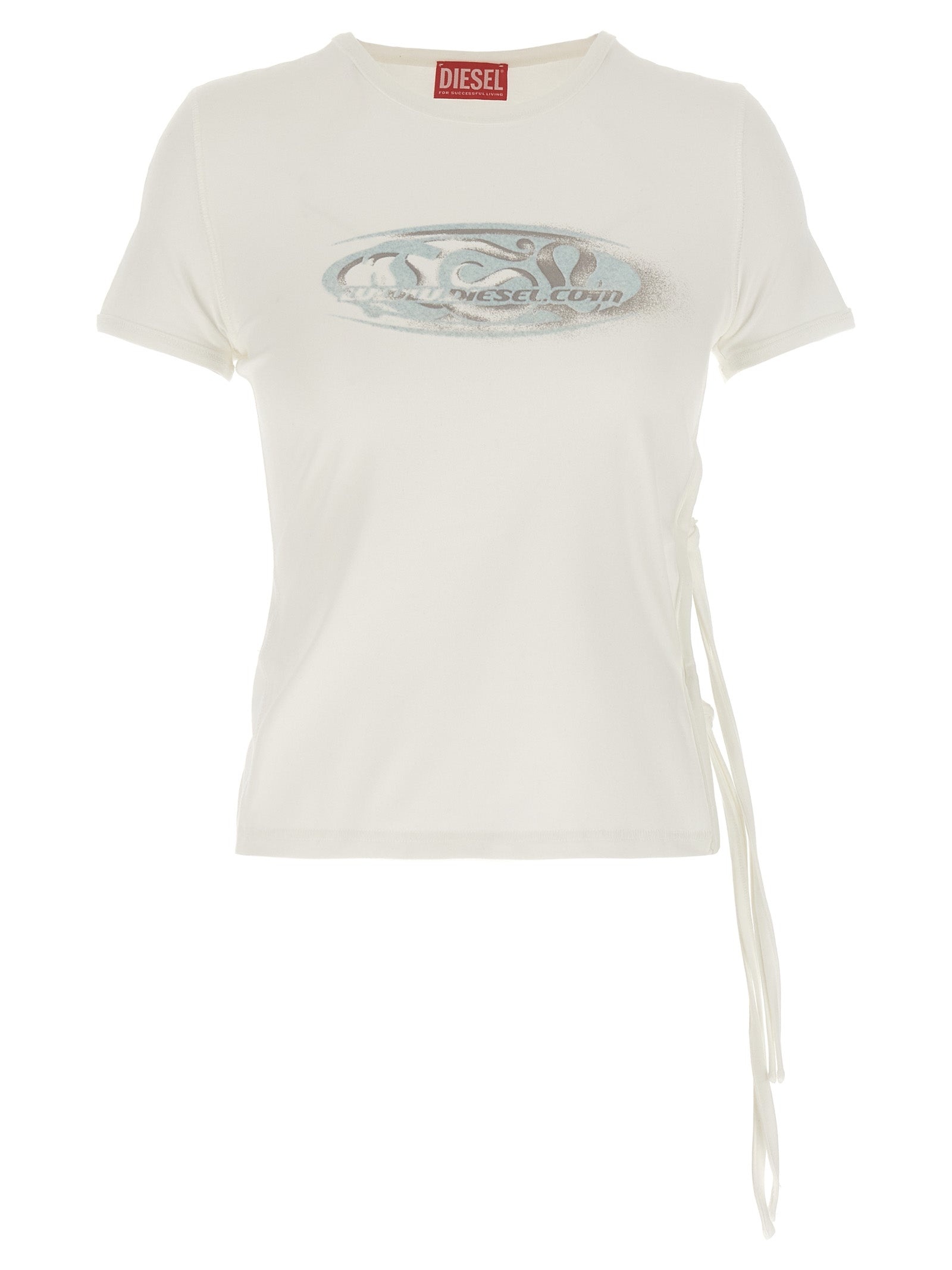 'T-Laya' stretch cotton jersey T-shirt with flocked texture print on the front, crew neck, short sleeves, tone-on-tone logo embroidery at the back, lace-up split on the left side. - Colour: White - Composition: 95% cotton, 5% elastane - Country Of Manufacture: Bulgaria - Dimension: Slim fit - MPN: A193680HQAH100