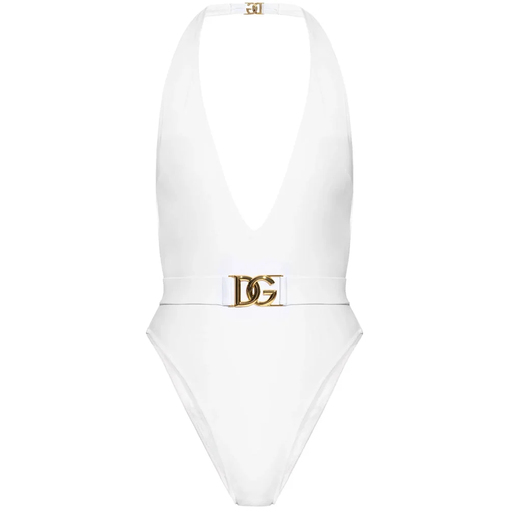 white stretch-design gold-tone logo plaque plunging V-neck logo-clasp fastening halterneck open back strap detailing belted waist high cut Be mindful to try on swimwear over your own garments. - Colour: White - Composition: Lining Composition Polyamide: 80.0%, Outer Composition Polyester: 75.0%, Outer Composition Spandex/elastane: 25.0%, Lining Composition Spandex/elastane: 20.0% - Country Of Manufacture: Italy - MPN: O9B74JONO12W0800